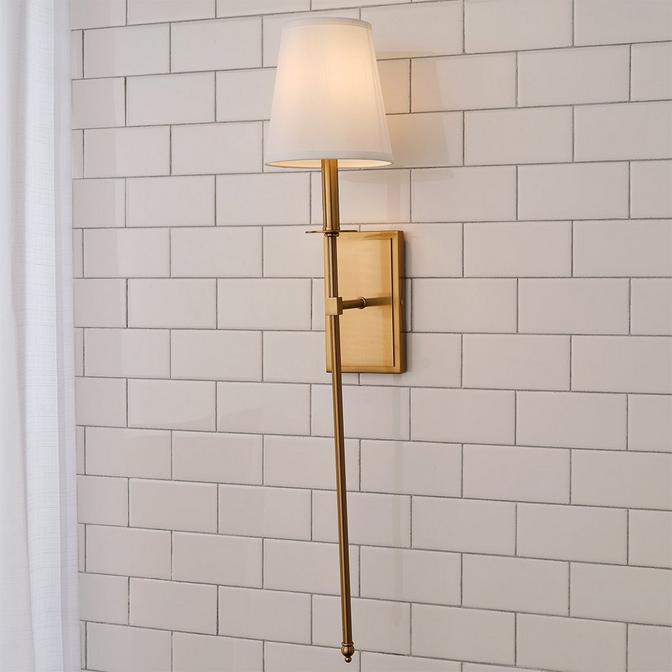 Najia's extravagant elongated shape complements its tapered fabric shade, creating a sophisticated and polished look. Elegantly illuminate a bathroom mirror or add a touch of warmth to your hallway, this sconce's beauty lies in its versatility. A simple design that helps create a timeless look to elevate your space!