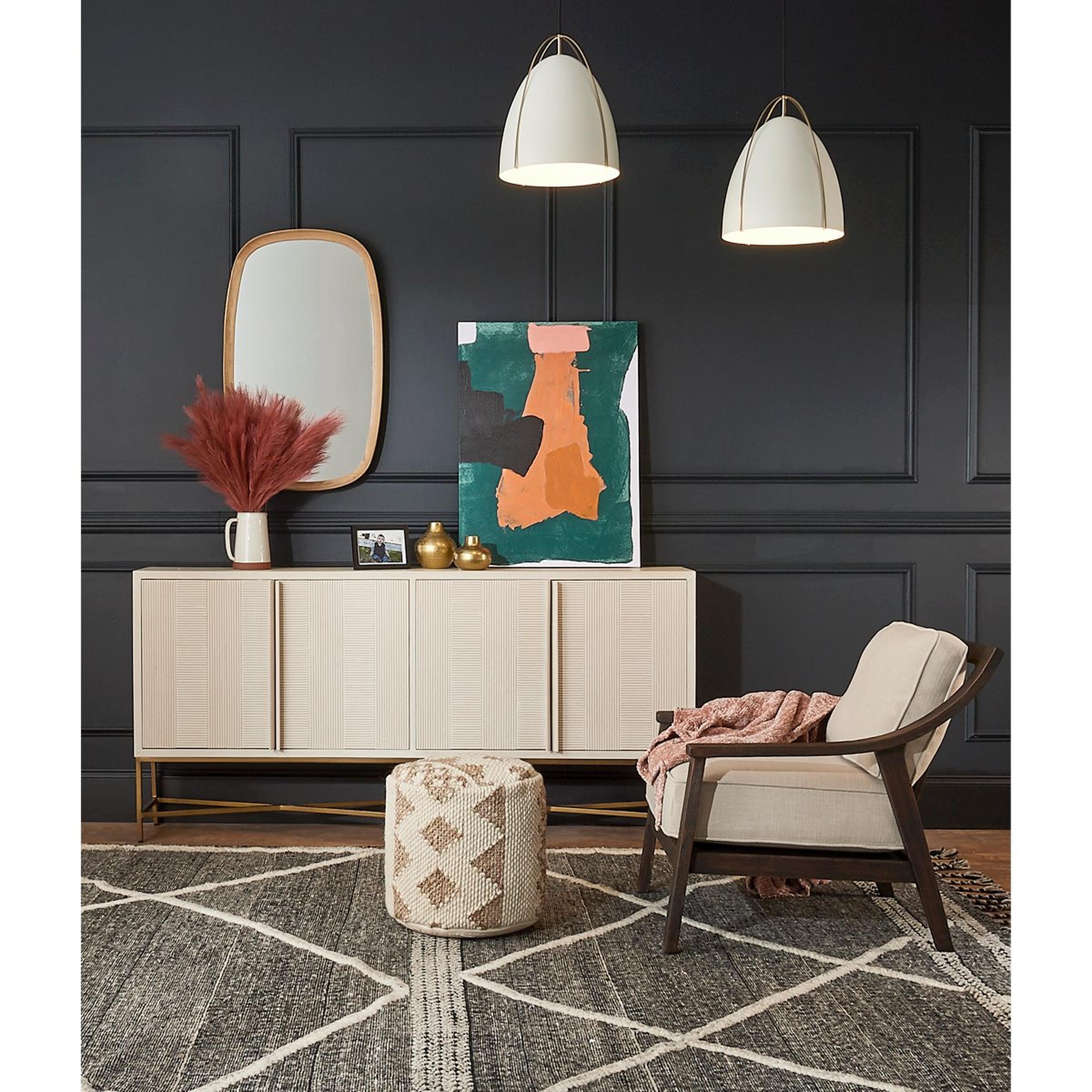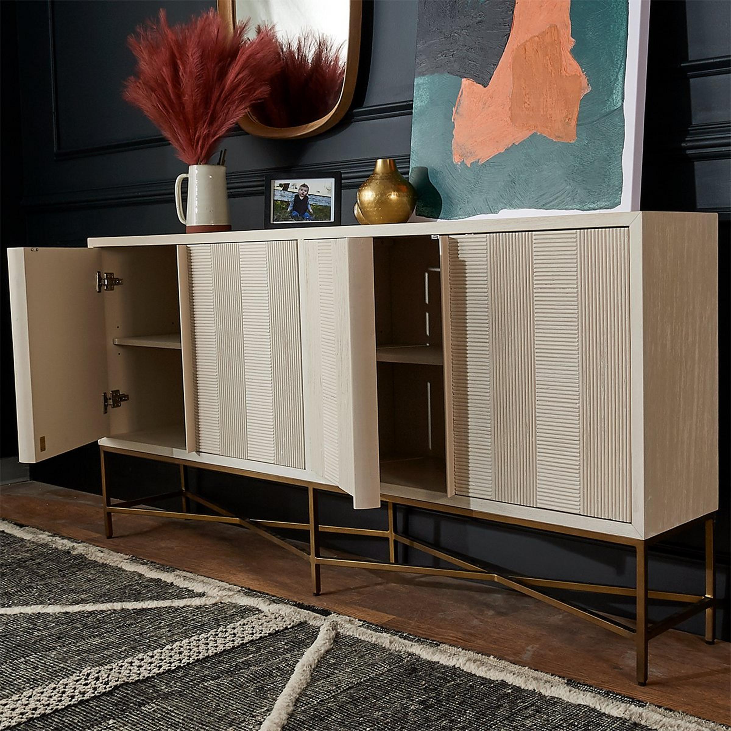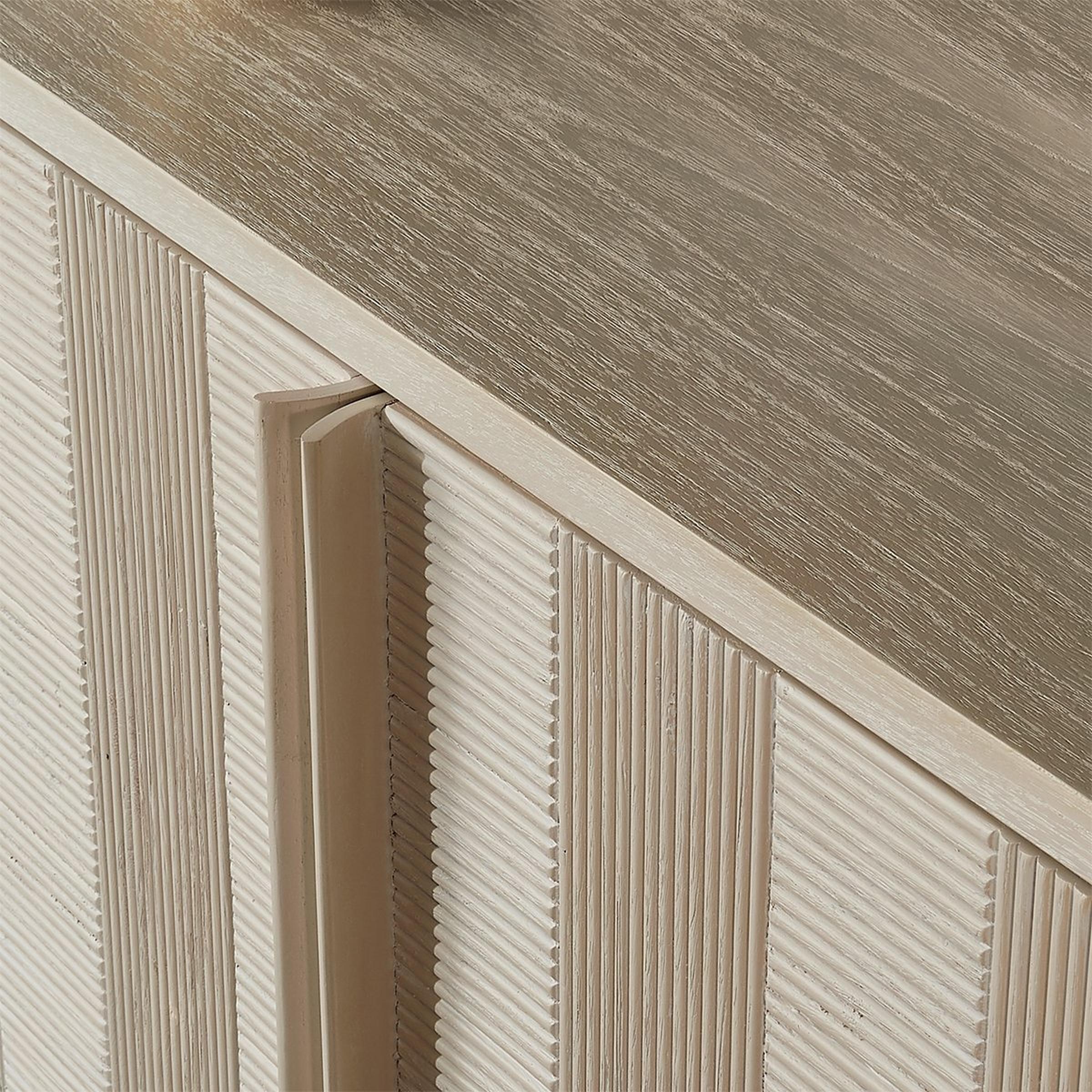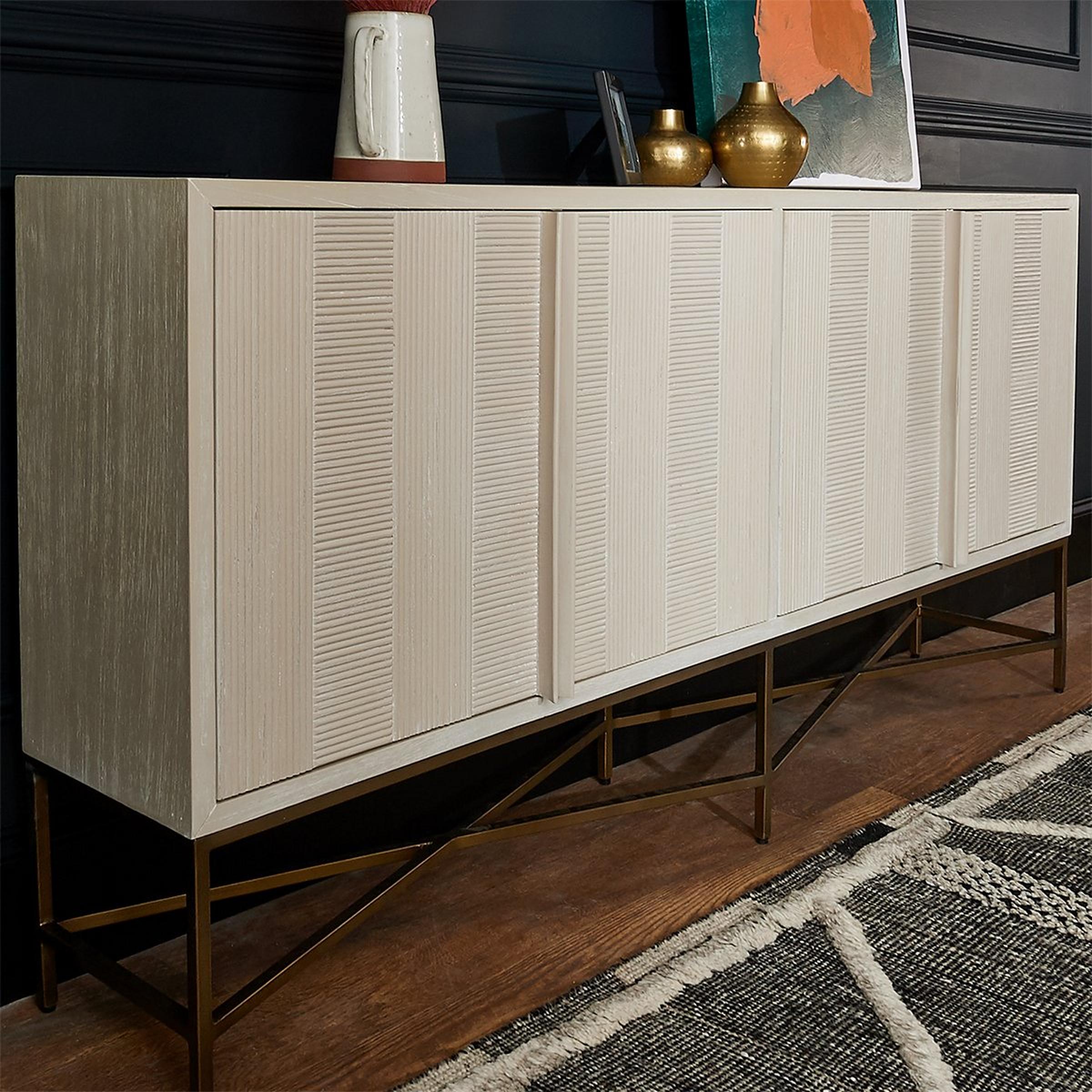 An elegant staple for your modern parlor, our Narrow Cerused Sideboard offers style and storage. The alternating warp and weft reeded panels create texture across the four doors. Hiding behind, a center shelf runs along with the piece for another surface to store your delicate China or favorite family board games.