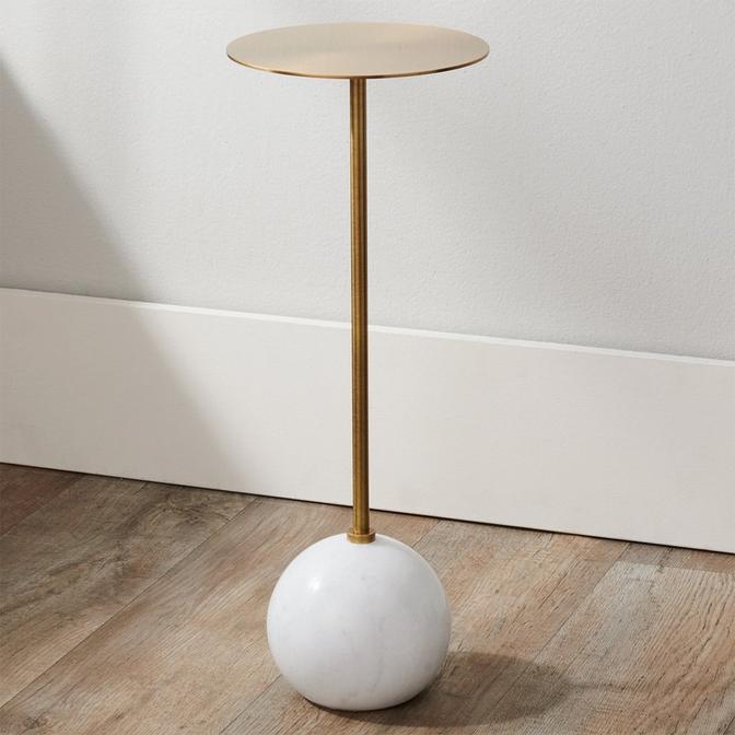 This elegant drink table is perfect for parties or just a quiet night at home. It has a solid brass top and a honed marble base. The natural characteristics of the marble means each piece will have unique veining patterns.