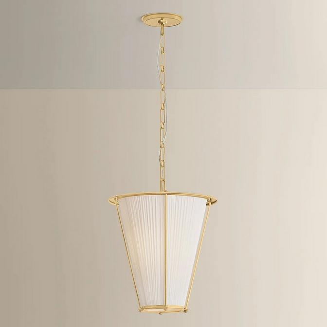 With a tapered linear frame and a breathtaking pleated silk shade, the Nereus Pendant is an exercise in contrasting materials. Nereus’s vintage silhouette embraces contemporary trends prioritizing an antique aesthetic, blending perfectly with traditional, grand millennial, and transitional décor as well as modern, minimalist, and mid-century interior designs. Sleek modern accents like a decorative chain and rivet detailing highlight Nereus’s versatility, while the lush silk shade adds luxurious glamour to understated spaces.