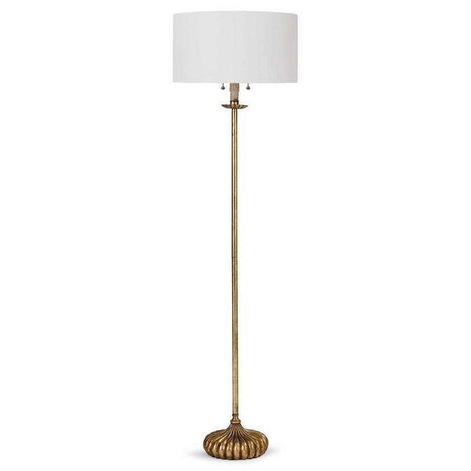 This floor lamp incorporates ornament with simplicity by juxtaposing clean lines with luxurious flourishes. Under its bold drum shade, the socket emulates a melting candlestick with faux wax drippings and even a small bobeche to finish the look. Its slim gilded frame ends in a fluted bottom that perfectly embellishes its opulent ornamentation. The rounded bottom is ornate but compact, ensuring this lamp easily slides into any space to illuminate with its two-bulb functionality. Control how you brighten your space with individual pull chains that complete its vintage look.