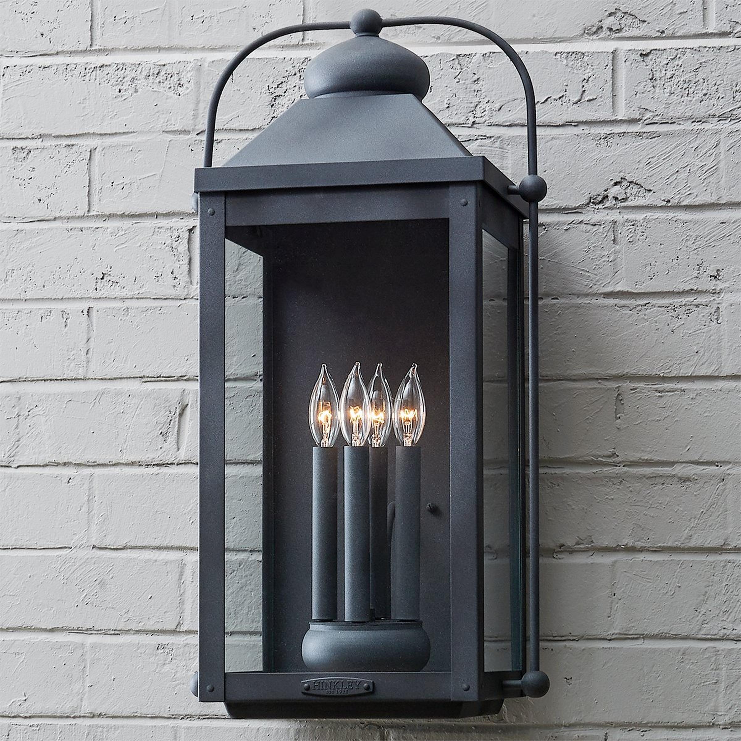 The early American outdoor wall lantern design crafted of solid aluminum reflects a bold yet refined silhouette. The Aged Zinc or Light Oiled Bronze finish and clear glass complement the long clean lines, elegant arched carriage handle and sturdy knobs, resulting in a vintage style with classic charisma. This style transitions from traditional to coastal homes.