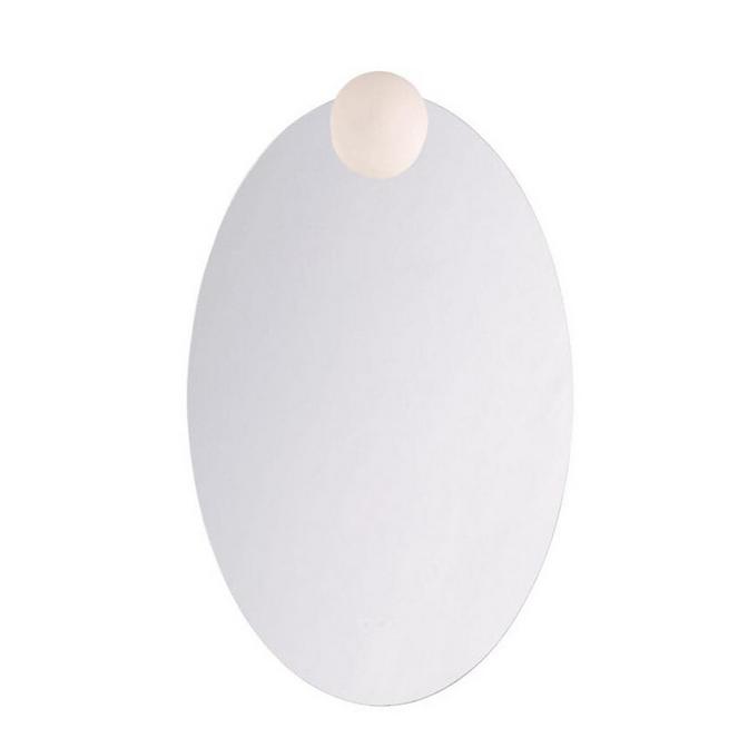 Elevated minimalism meets an ethereal edge with this frameless mirror's simple oval shape and opal glass orb. The protruding globe illuminates your space with its abstract design, elevating the classic mirror's feel with a more artistic touch. A soft glow emanates from the back of the mirror, enveloping its elongated shape in a halo of light. Equipped with convenient touch-screen technology, use the subtle bottom buttons to dim lights and activate the defogging feature that elevates your daily routine.