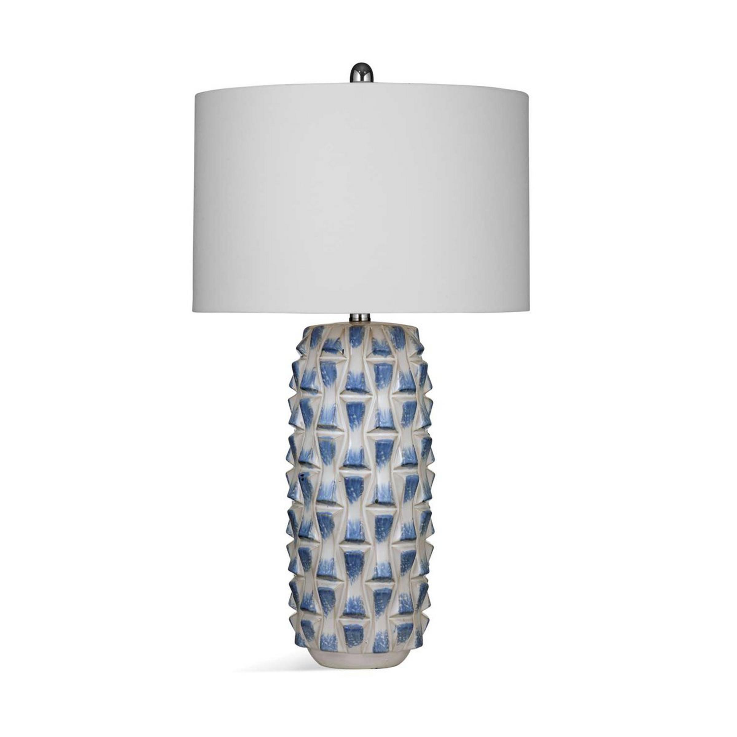 Stunningly crafted and painted, this ceramic table lamp has a stunning silhouette. Angular intersections protrude from the beautifully painted accents of Oberlin's base. Completing the look is a crisp linen drum shade coordinating the impressive look.