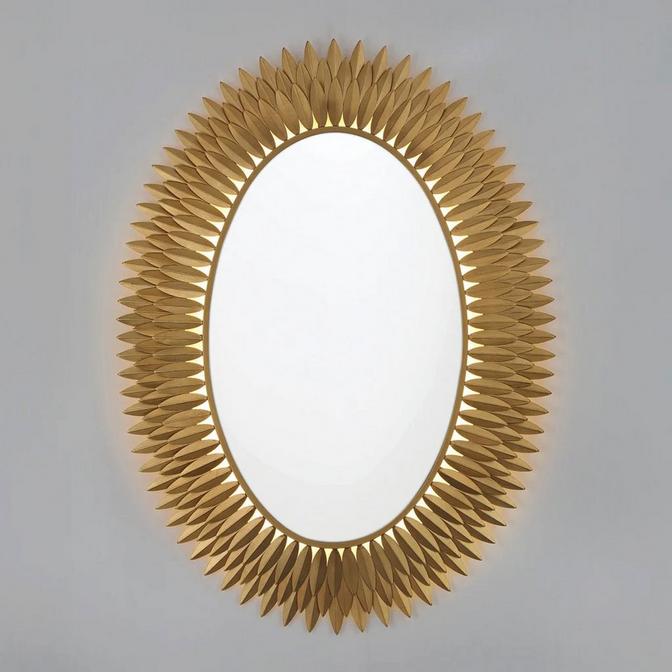 A poetic fusion of nature and opulence, the sculptural Olive Leaf Mirror evokes a lush forest at dusk. Its wreath-like frame unfurls with elongated leaves that shimmer with botanical grace, creating a stunning halo that radiates from within. This captivating piece is perfect for enhancing a bedroom, living area, or any space that craves a touch of drama. Install this above a bathroom vanity to serve as a flashy focal point, or hang a sconce on each side to combine each piece into a trio of well-designed décor.
