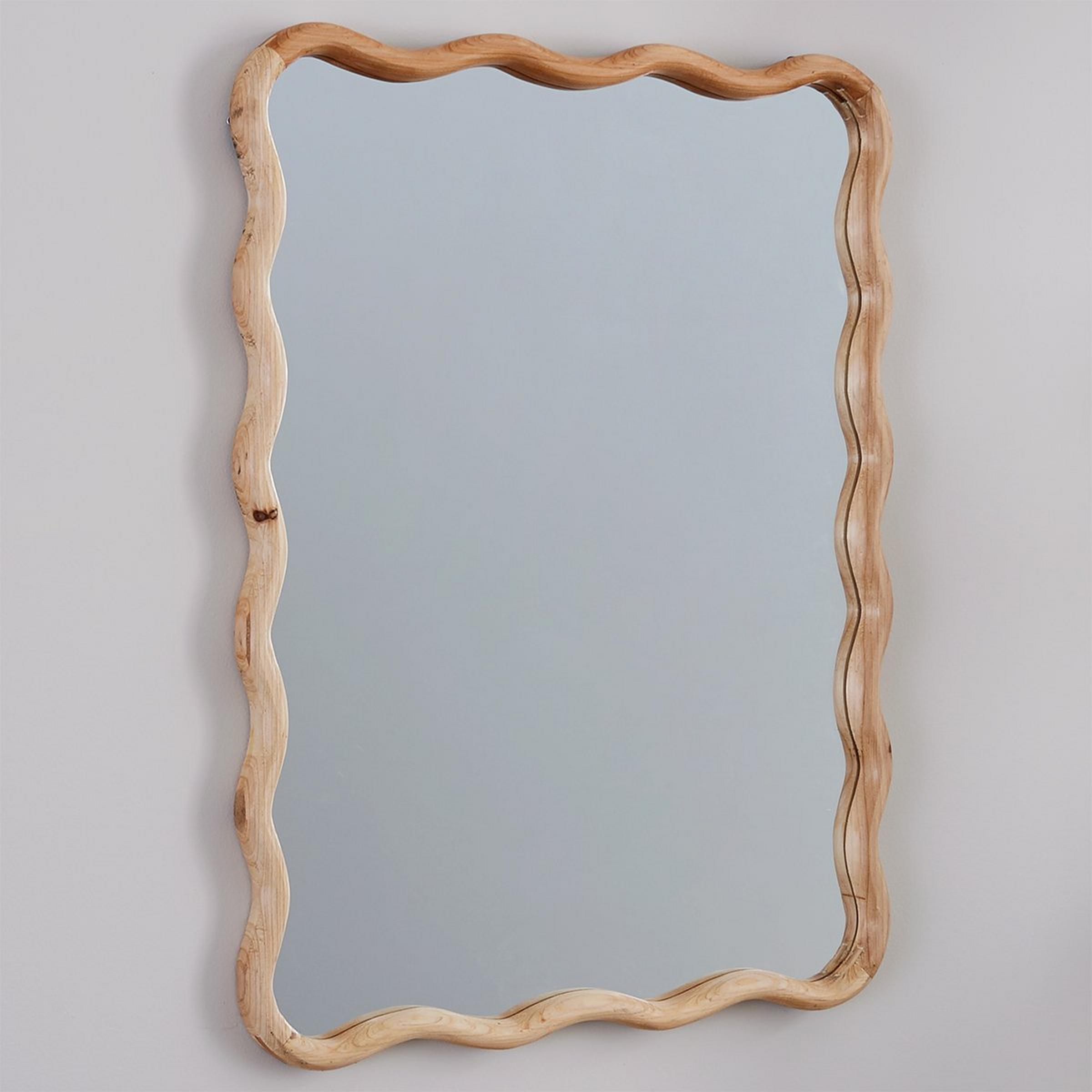 Balancing a postmodern silhouette against natural wood tones, our Olsen Squiggly Mirror brings an organic hint of nuance to the wavy mirror trend. The perfect piece for your chic bathroom vanity or artsy entryway, this quirky statement accessory adds texture, depth, and movement to any space.