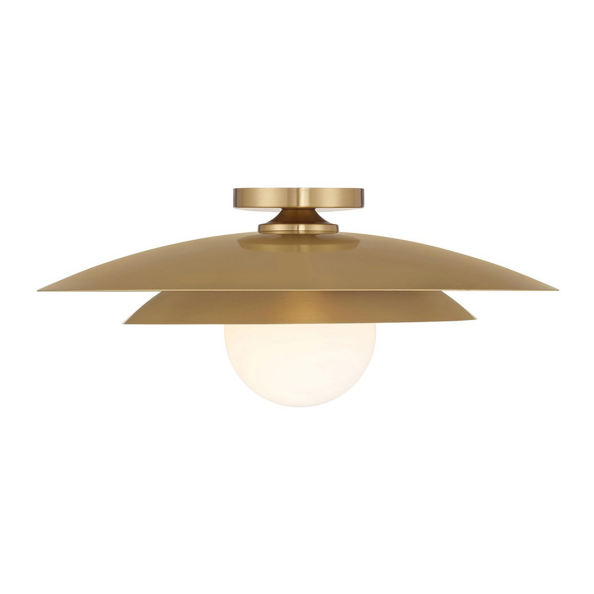 This flush mount's dynamic layered shades form a sleek mid-century aesthetic that boldly brightens your space. Its opal glass conceals your bulb and diffuses light for a functional yet cohesive look. Spark a nostalgic feeling with this retro piece that adds a delightful charm!