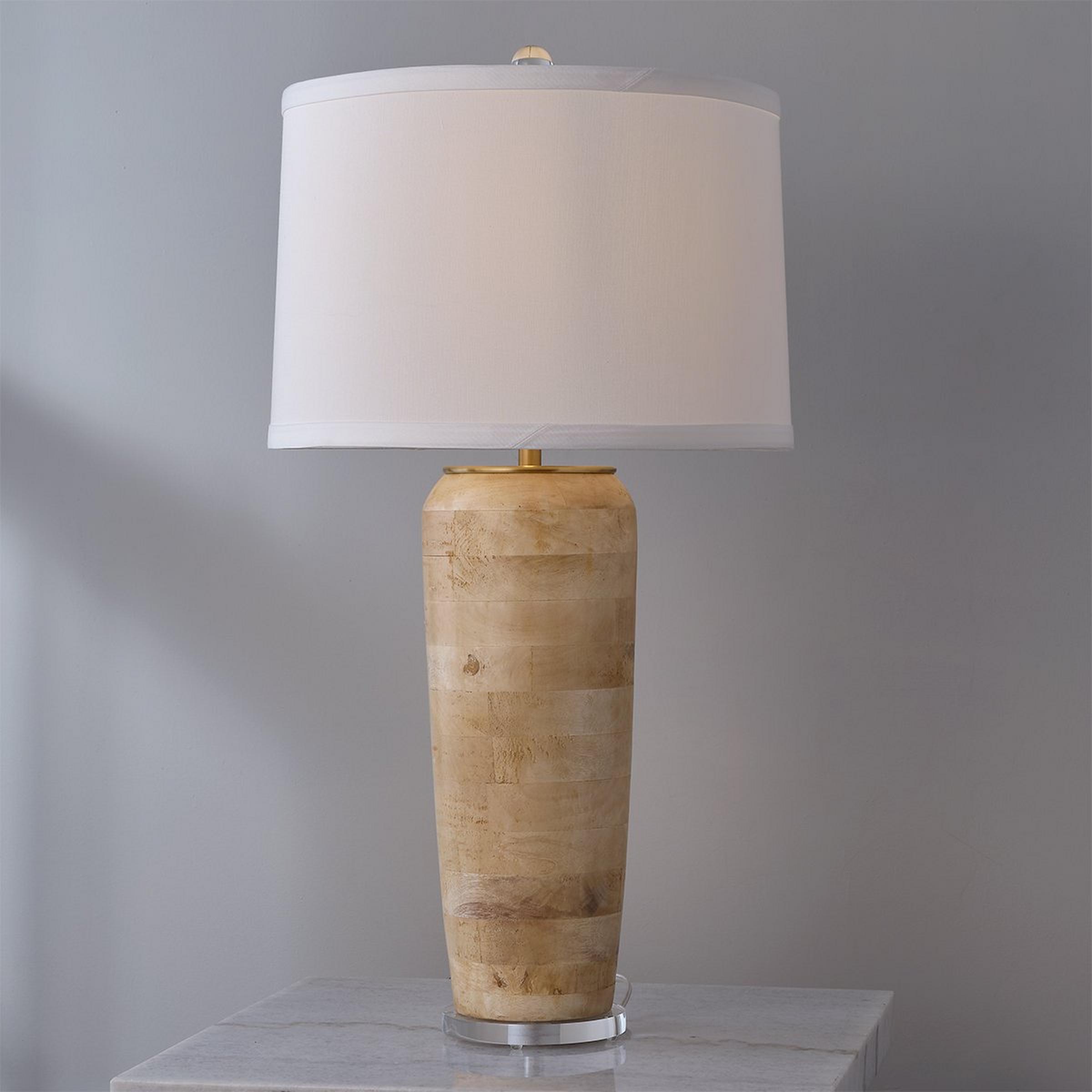 The Oro Timber Table Lamp elevates any space with understated elegance. Its tall wooden form is paired with a crystal-clear acrylic base and brushed brass accents, creating a sophisticated balance between natural texture and sleek design. Topped with a crisp white linen drum shade, it’s the perfect accent for modern living rooms, entryways, or bedrooms. Due to the nature of natural products, no two will be exactly alike in pattern or color. This lamp is assembled by hand in our Richmond, Virginia production facility.