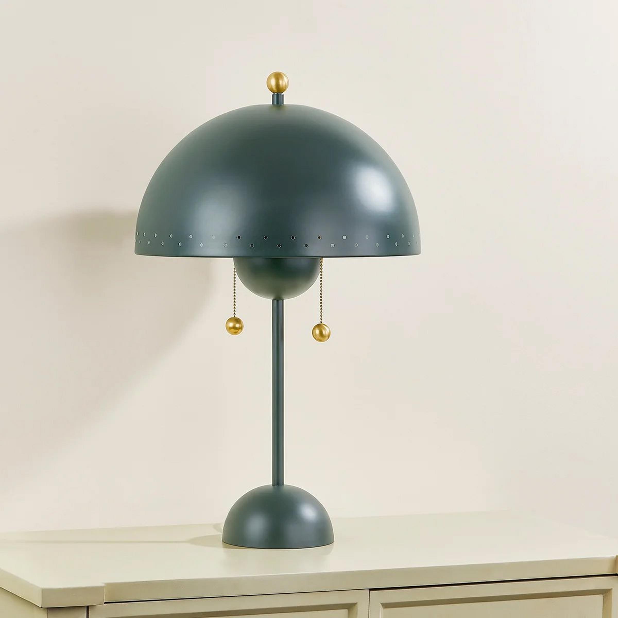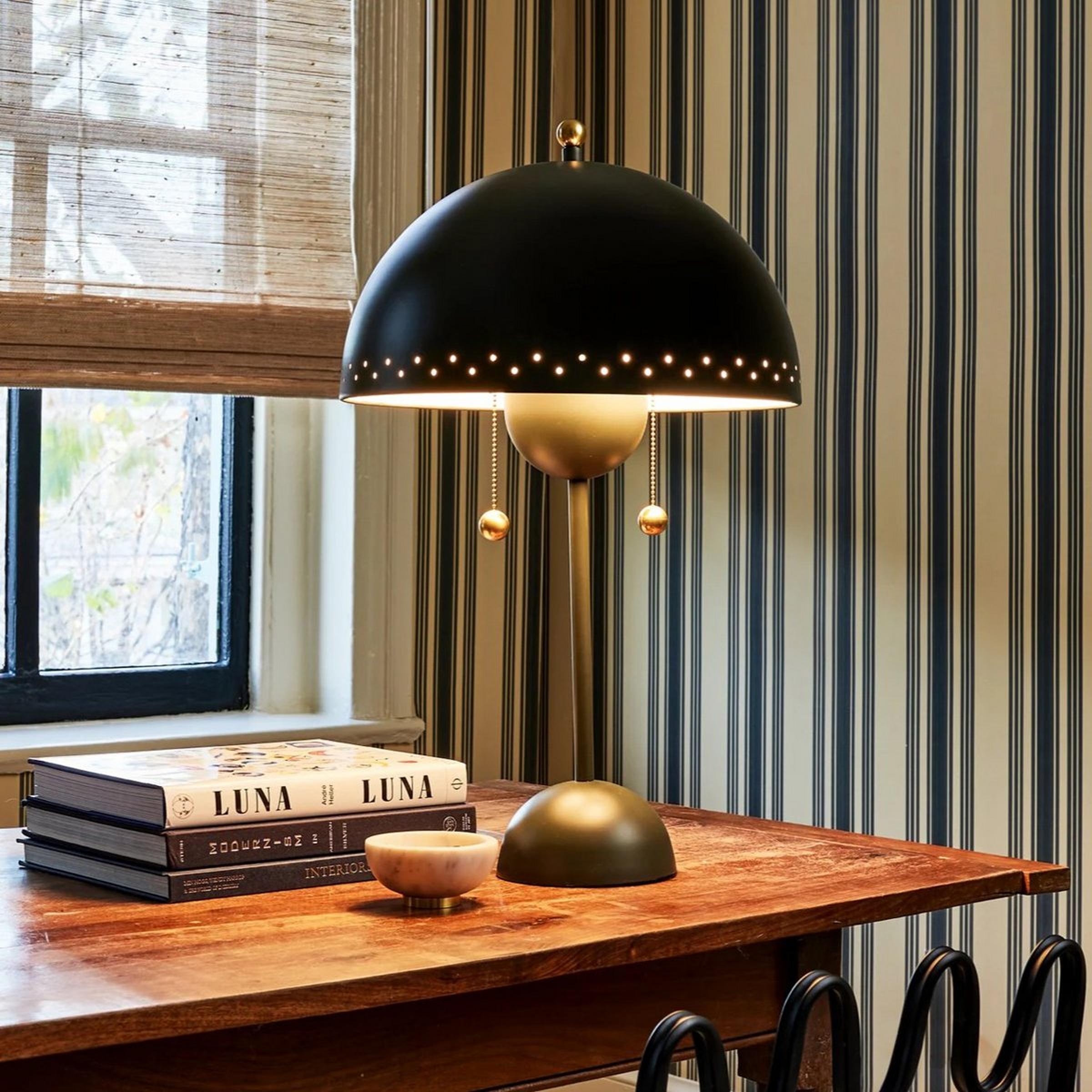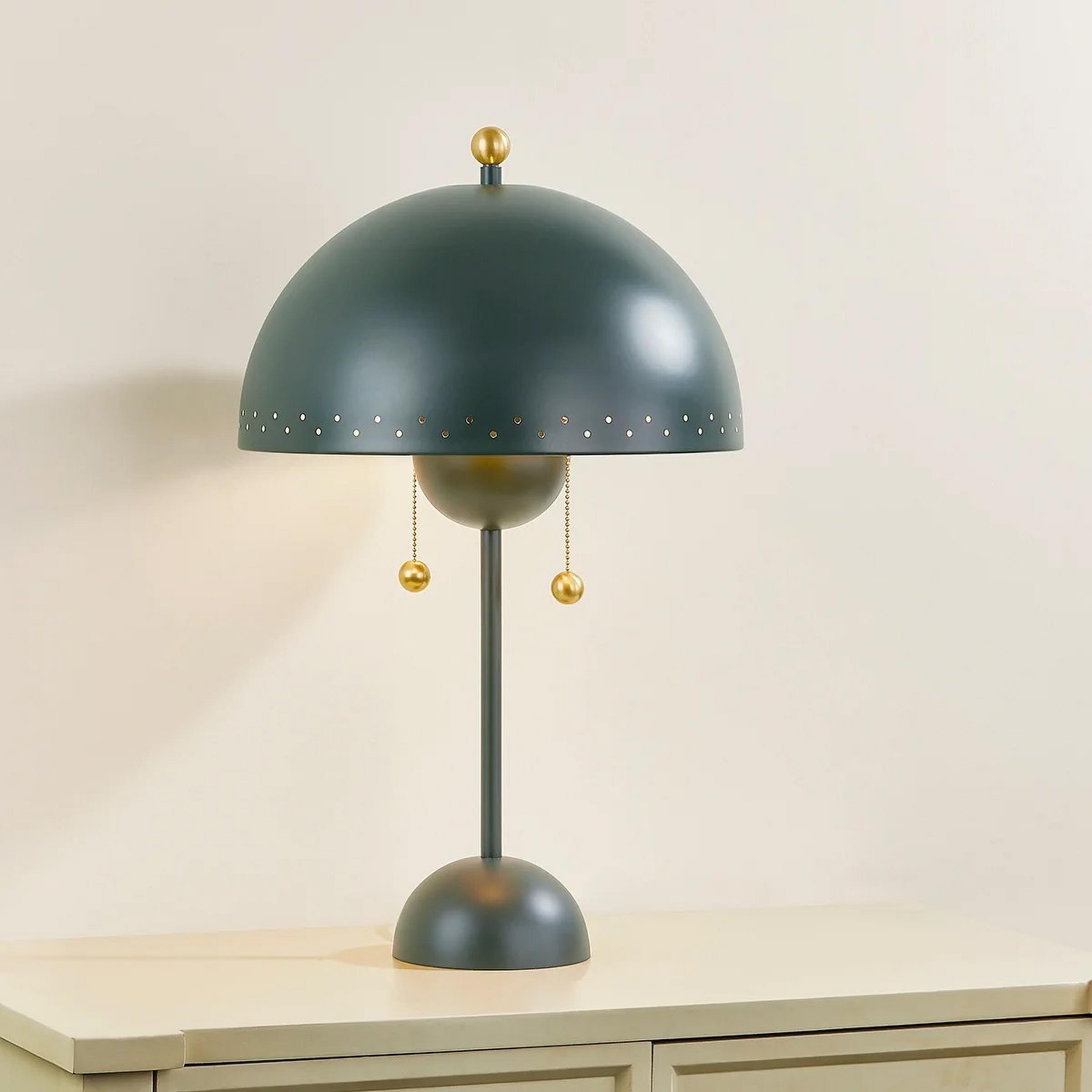 Simplified shapes and subtle details allow the Otis Table Lamp to stand above the rest. Brass spheres at the ends of the pull-chains match the decorative finial, while perforated holes punctuate the bottom of the shade, making an elaborate fixture that expertly illuminates a room.