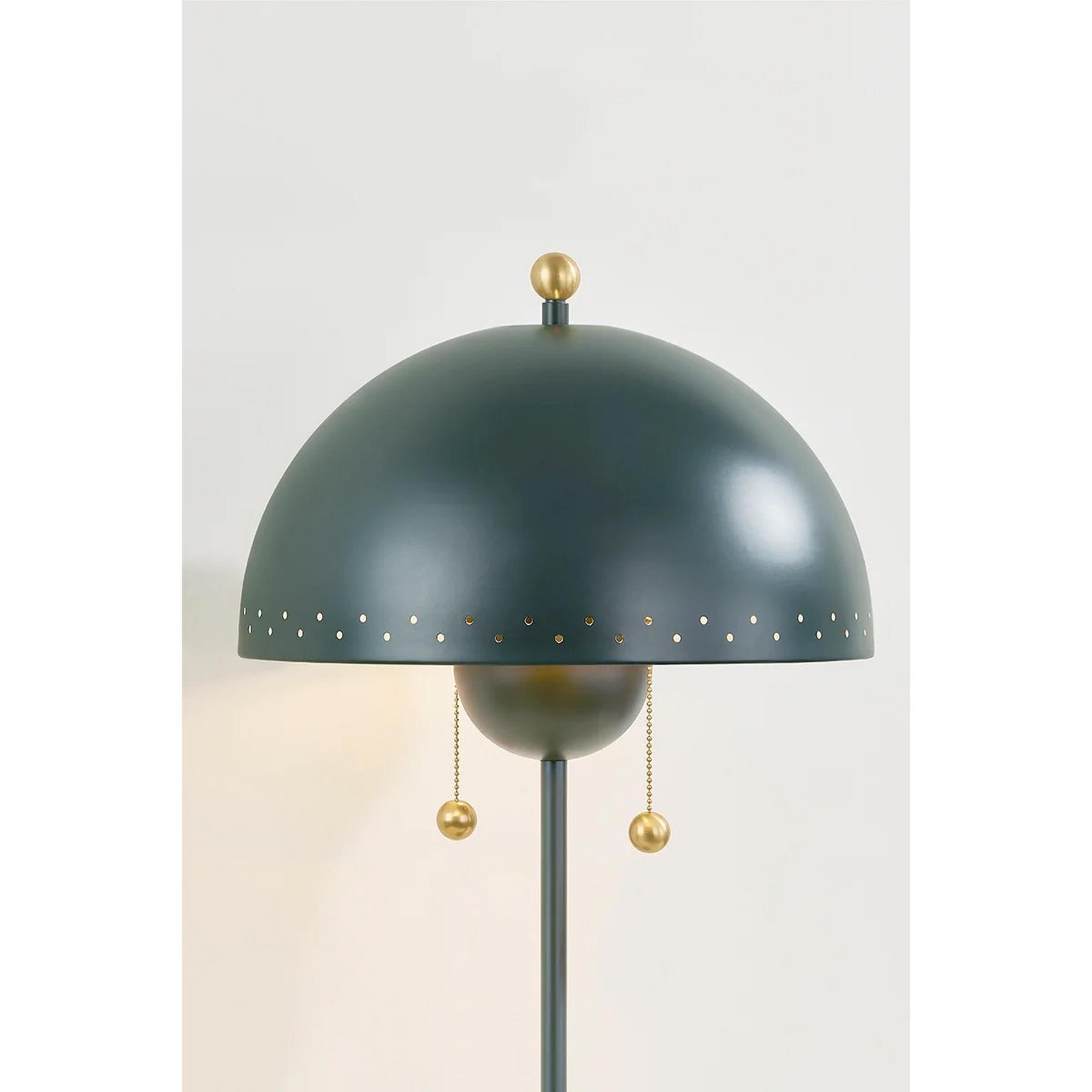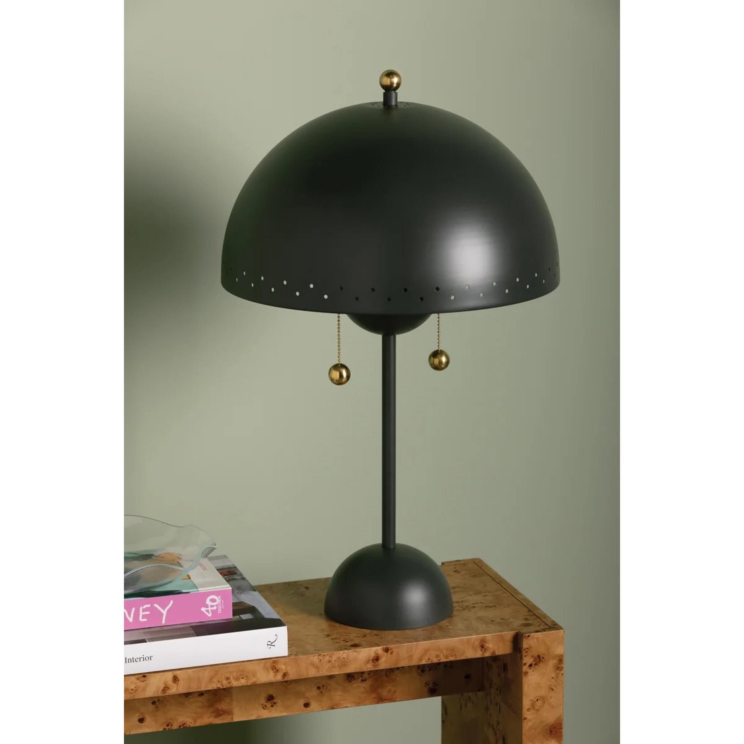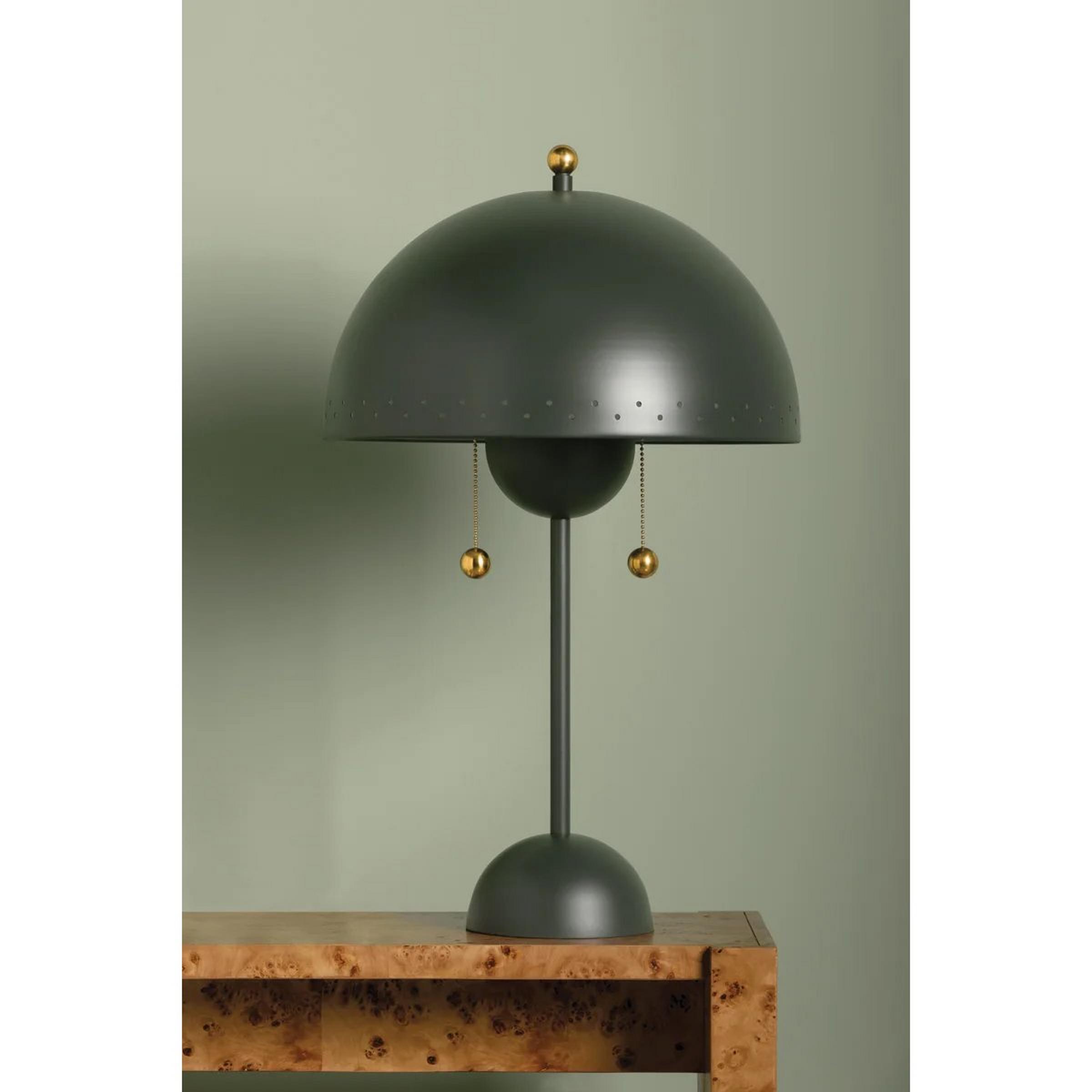 Simplified shapes and subtle details allow the Otis Table Lamp to stand above the rest. Brass spheres at the ends of the pull-chains match the decorative finial, while perforated holes punctuate the bottom of the shade, making an elaborate fixture that expertly illuminates a room.
