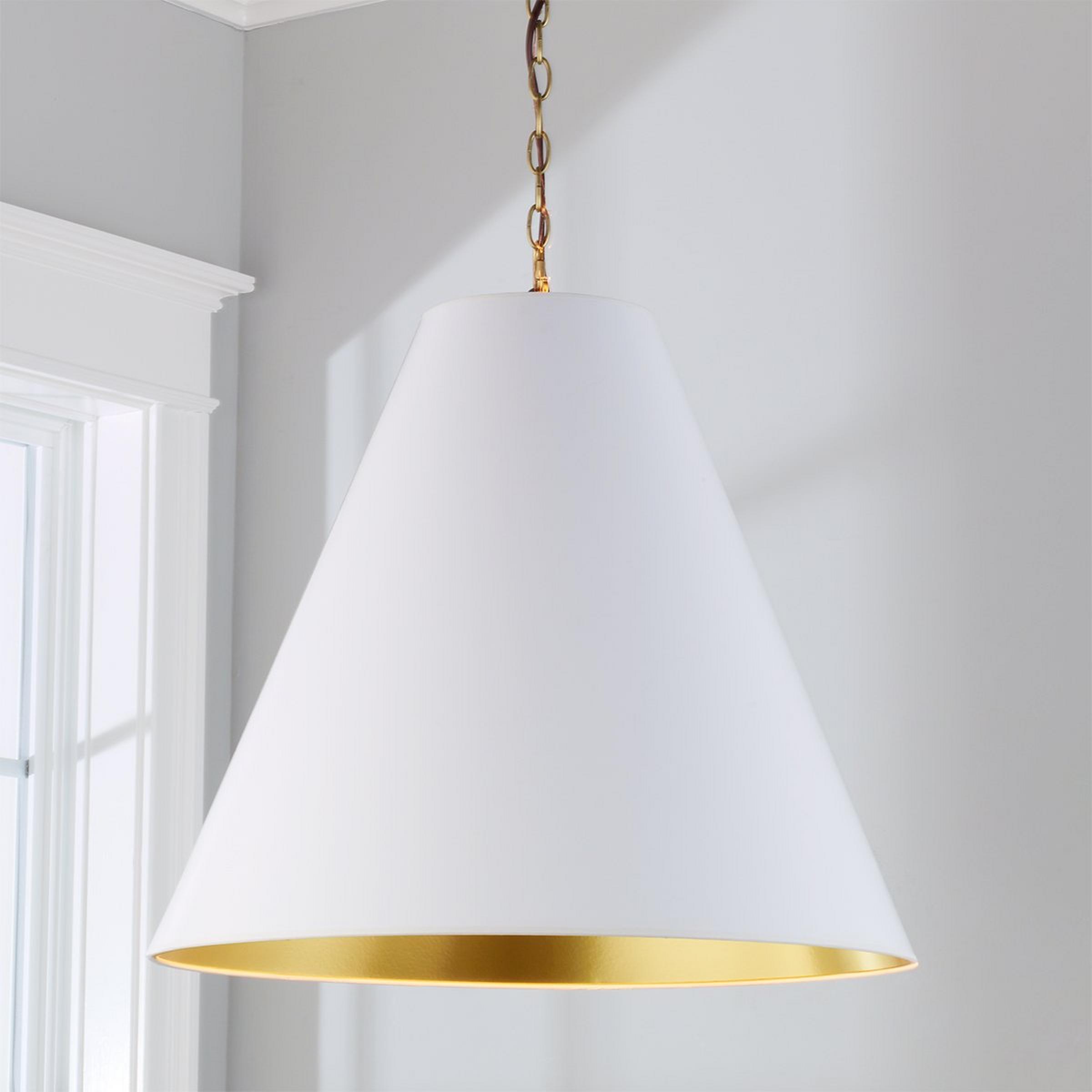 An oversized cone paper shade in trendy modern colors will give your space a punch of interest. Hang two over your kitchen island or a long dining table. Some Assembly required.