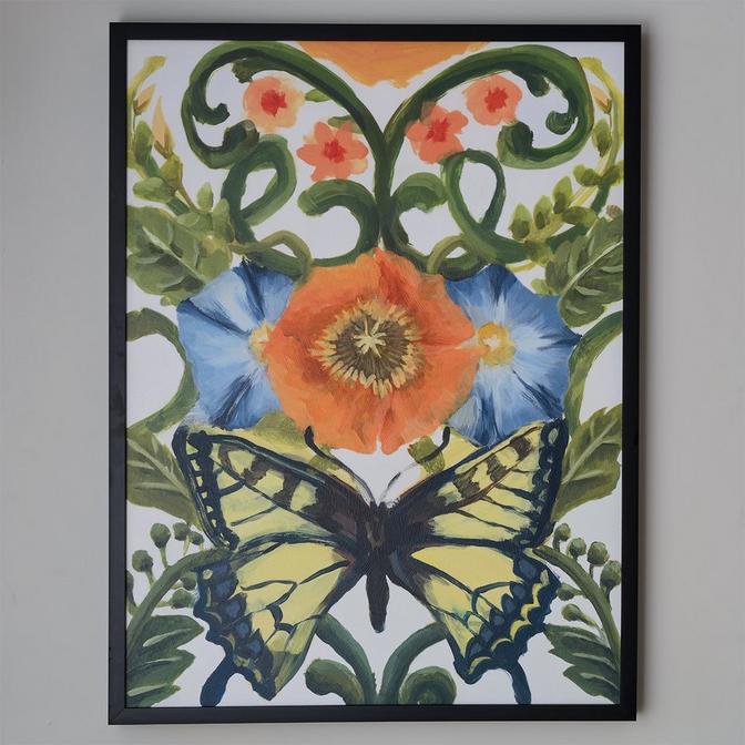 Transform your home into a beautiful and enchanting haven with the Papilio Wall Art. With its stunning combination of vibrant vines, bewitching blooms, and a resplendent butterfly, this artwork is the perfect way to add a touch of magic to your living space and brighten up your day. With a sleek 1" black frame to finish off this piece, it'll be ready to hang as soon as it arrives.