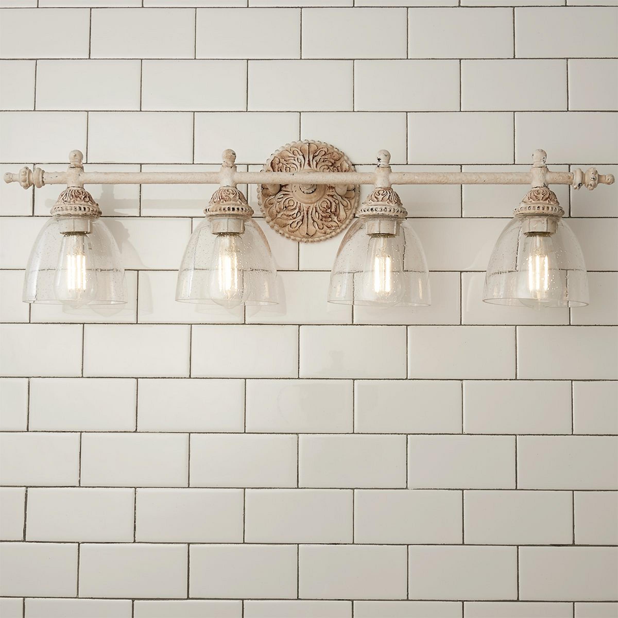 We are amazed by the detail in our Paris Market Vanity Light. The round backplate showcases acanthus leaves engraved ornamentation that flows to the caps of the clear seeded light shade to create the unique look of French country bathroom lighting. This fixture will bring a European feel to your newly revamped bathroom.