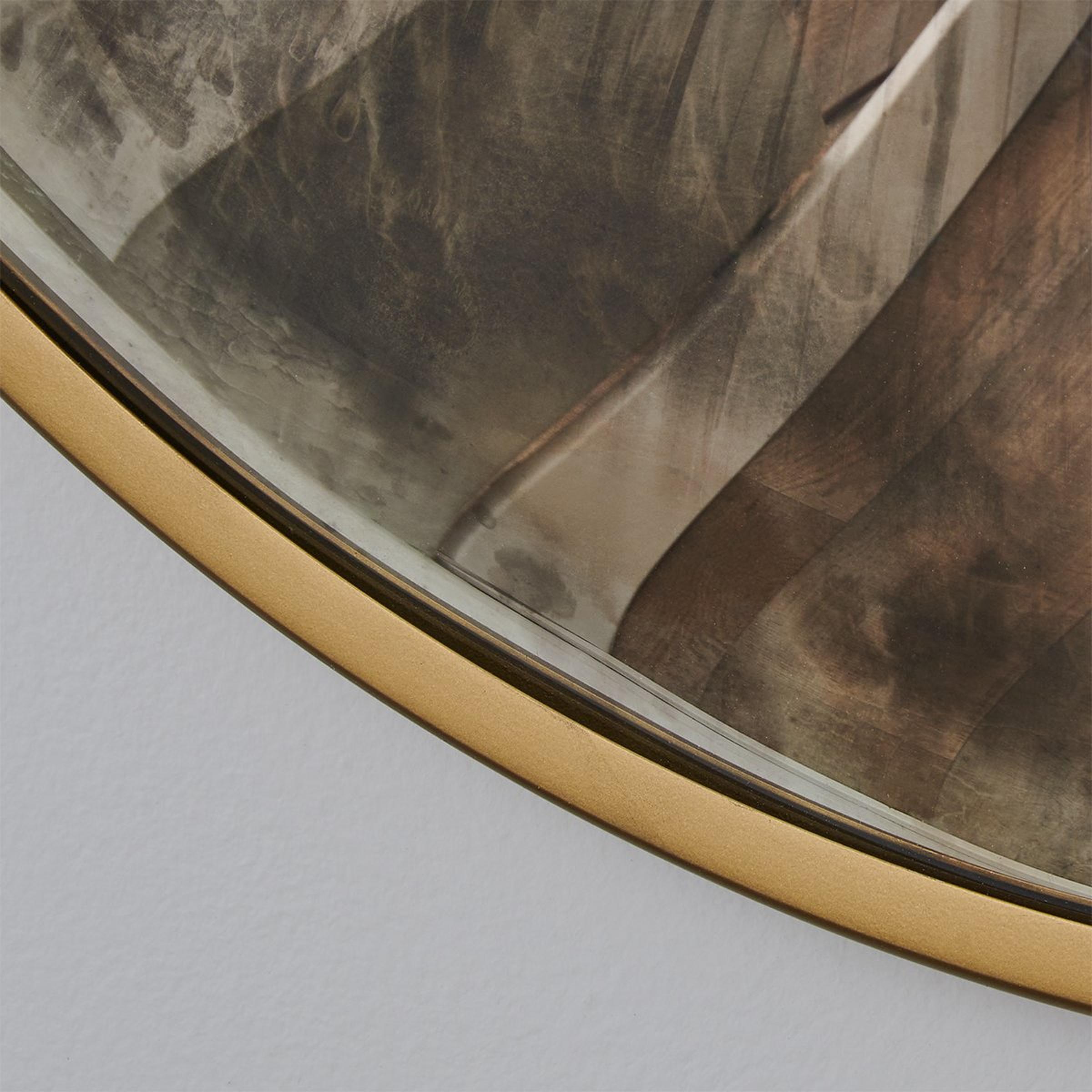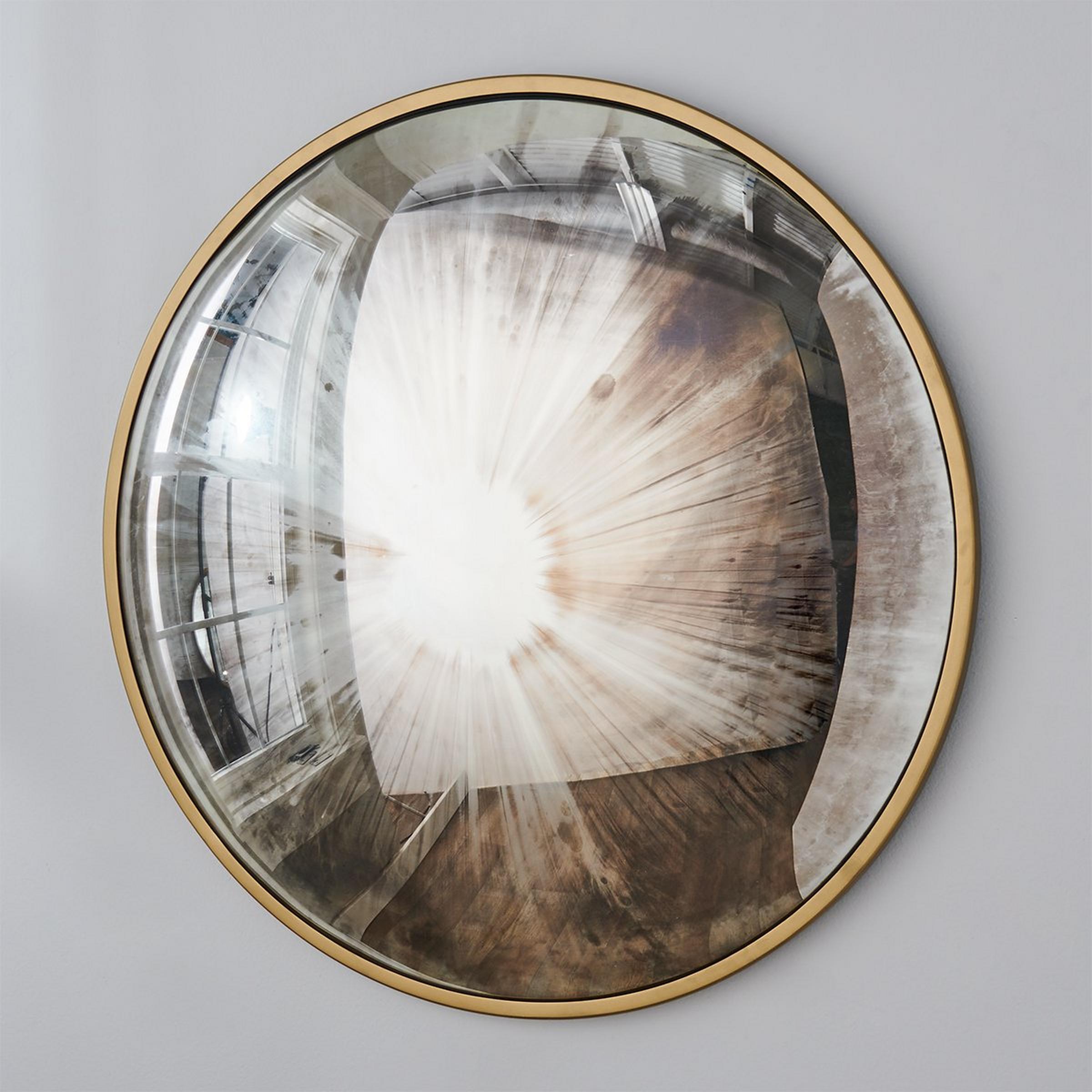 The Pehtra Mirror is a true work of art - a round convex mirror with antique mirror glass and a gold leaf frame, exuding a unique and captivating charm. Its heavily antiqued and hand-applied effect adds to its weathered yet timeless beauty.