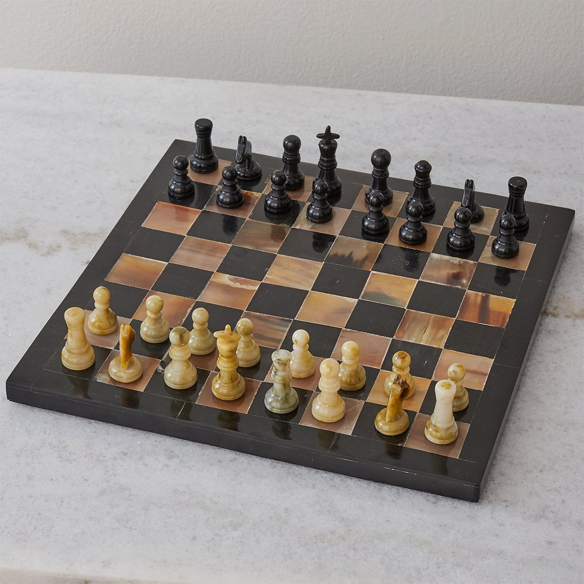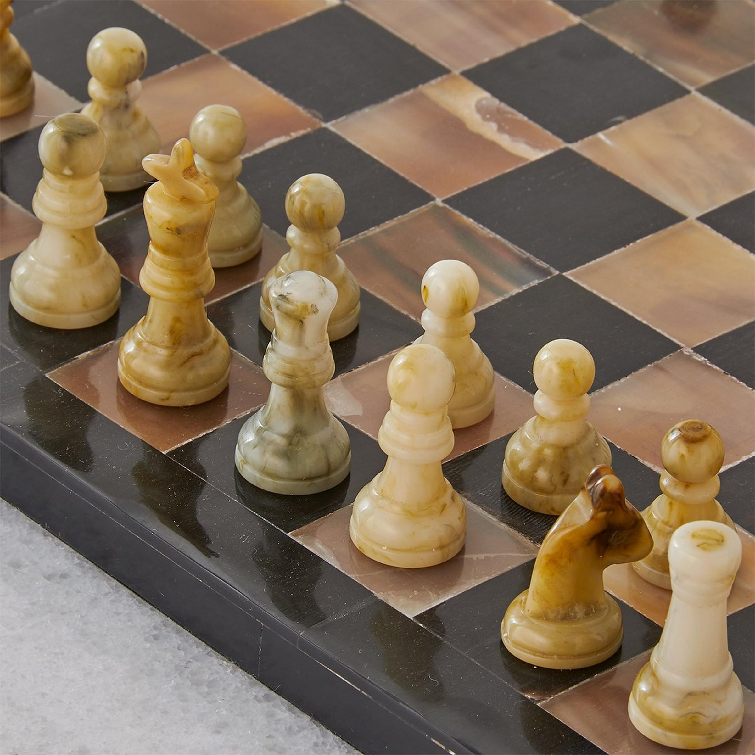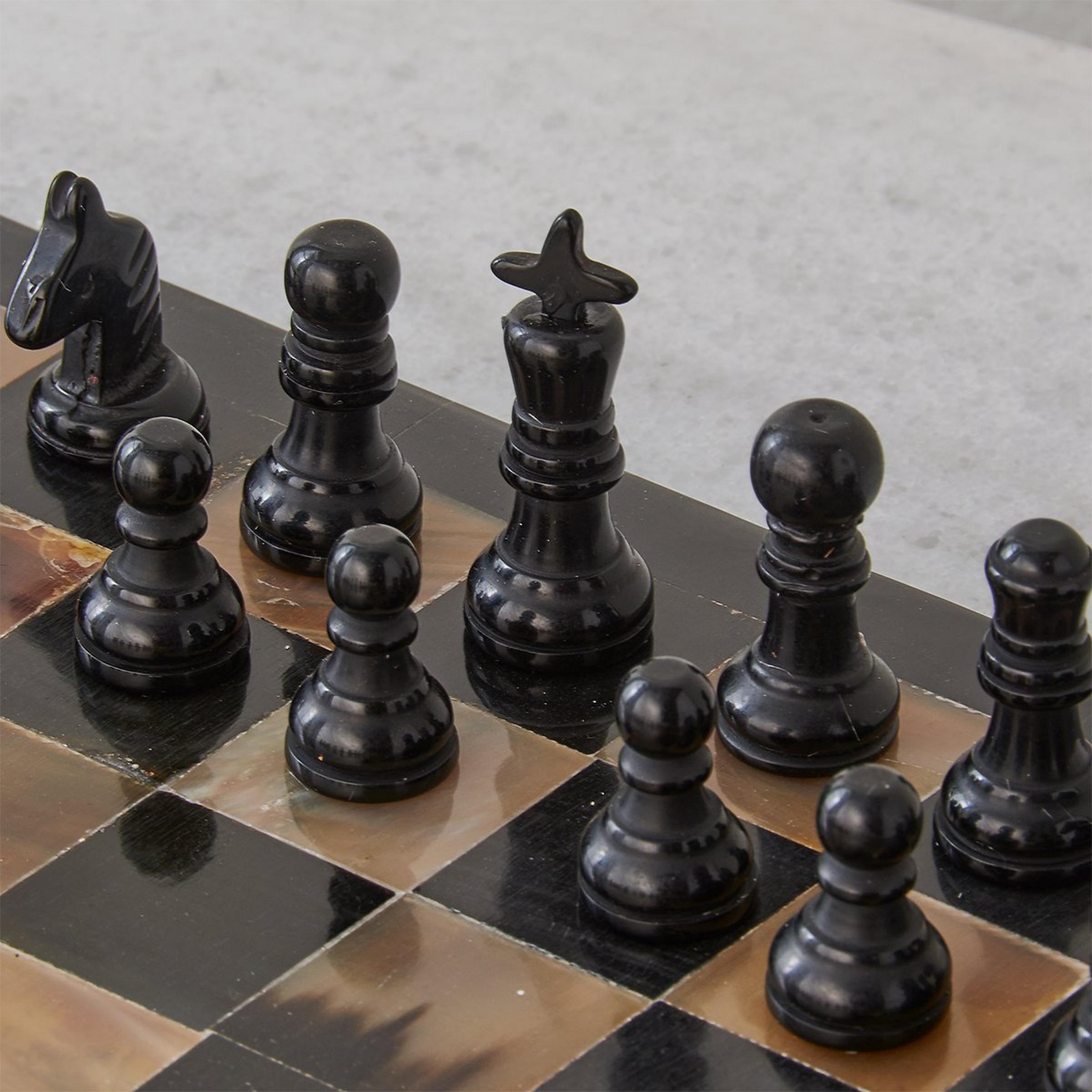 The game is on with this distinctive natural horn chess set. Perfect for your library or office, you'll be so busy admiring each unique piece you may just hear, "Checkmate" before you've had a chance to get your bearings. Because this product is made of natural materials no two will be exactly alike in construction, adding to the unique charm and beauty of this lovely piece