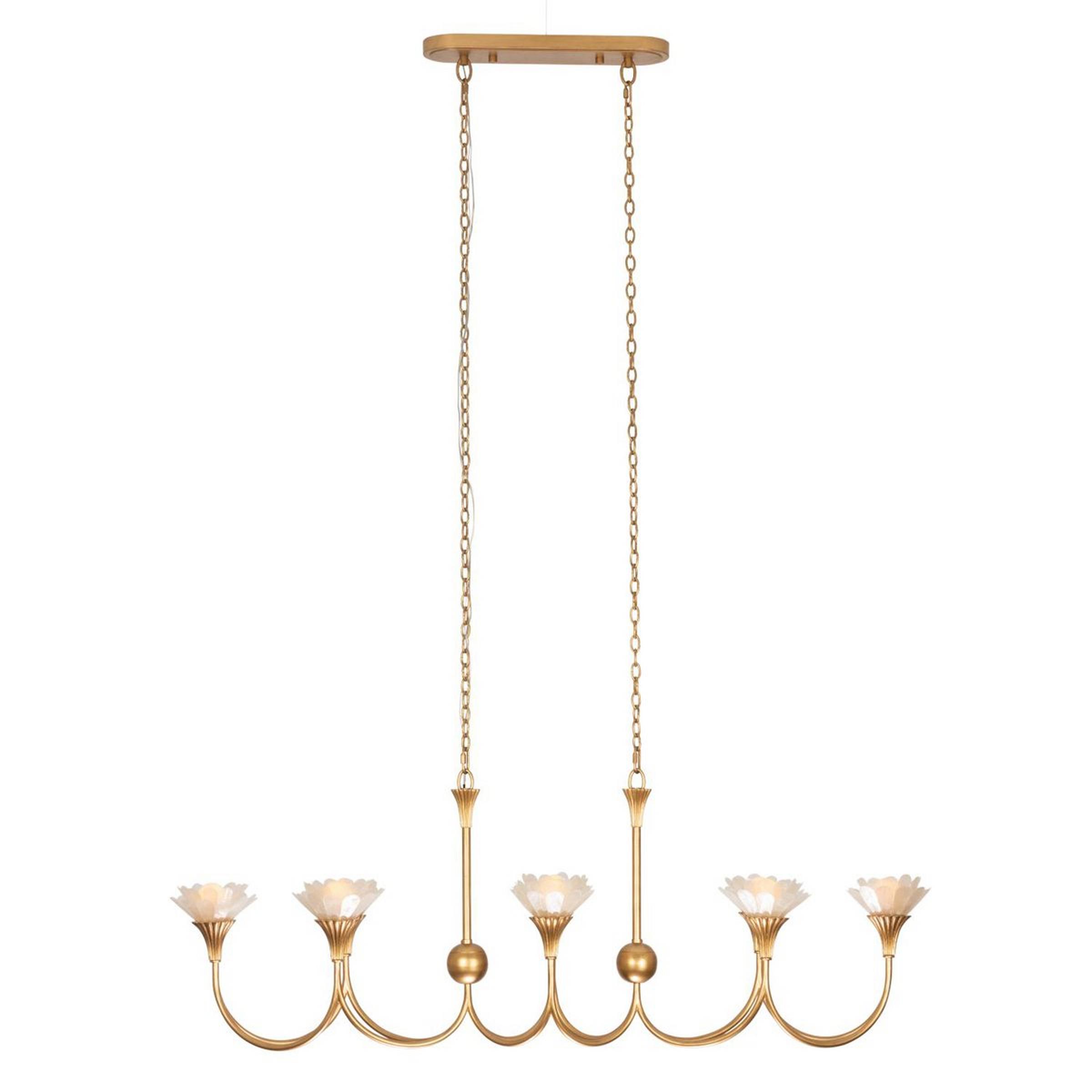 The Persimmon Linear Chandelier is a dainty choice for an elegant kitchen island or dining table. The natural capiz shell atop swooping support rods spreads even lighting. The design of the fixture is full of inspiration as the shades resemble flower petals, garden foliage, and stained glass masterpieces. Due to the natural material used, variances in tone and color may occur; no two pieces will be identical.