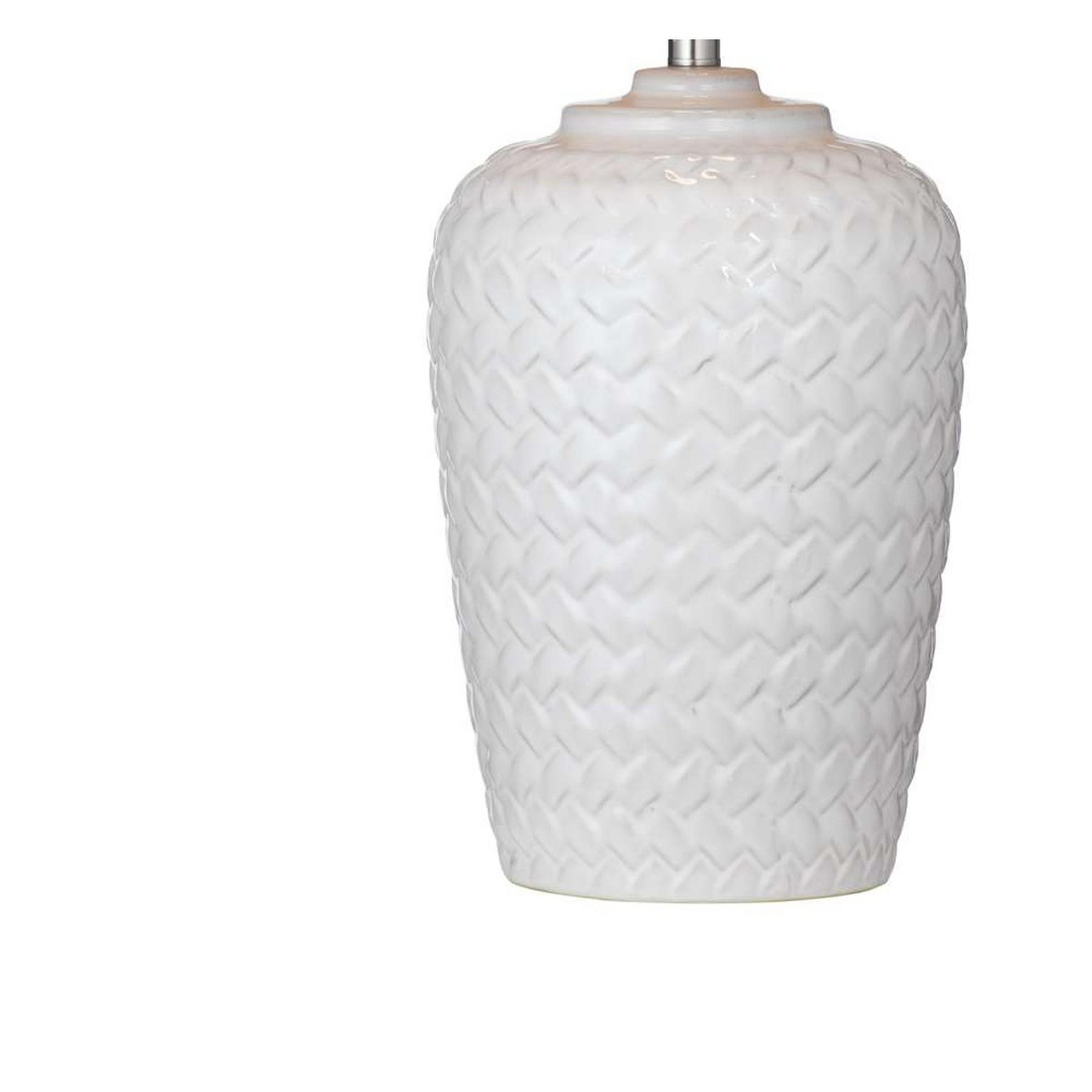 The Petrel Table lamp uses a playful mix of materials to provide a sophisticated accent to any side table or nightstand. The woven raffia fibers that form the shade add a natural texture, a warm glow, and an inviting atmosphere. The ceramic base has a decorative pattern that resembles braided rope. In this way, the base and shade both share a common visual language even though they are made of contrasting materials, evoking in tandem images of woven baskets and organic foliage. Place this alongside neutral decor to allow it to shine as a fabulous accent.