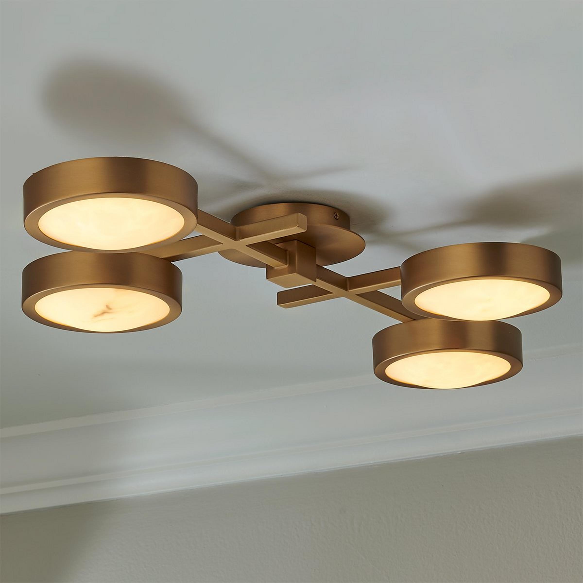 This fixture adds a pop of texture and pattern to a space. Versatile, it can be installed as a flush-mounted ceiling light or as a wall sconce for a playful accent. Metal circles hold disks of diffuse, faux alabaster with a stony visual texture lit by an integrated LED within. Due to the nature of the textured glass, its veins and markings will vary in tone and pattern; no two pieces will be exactly alike.