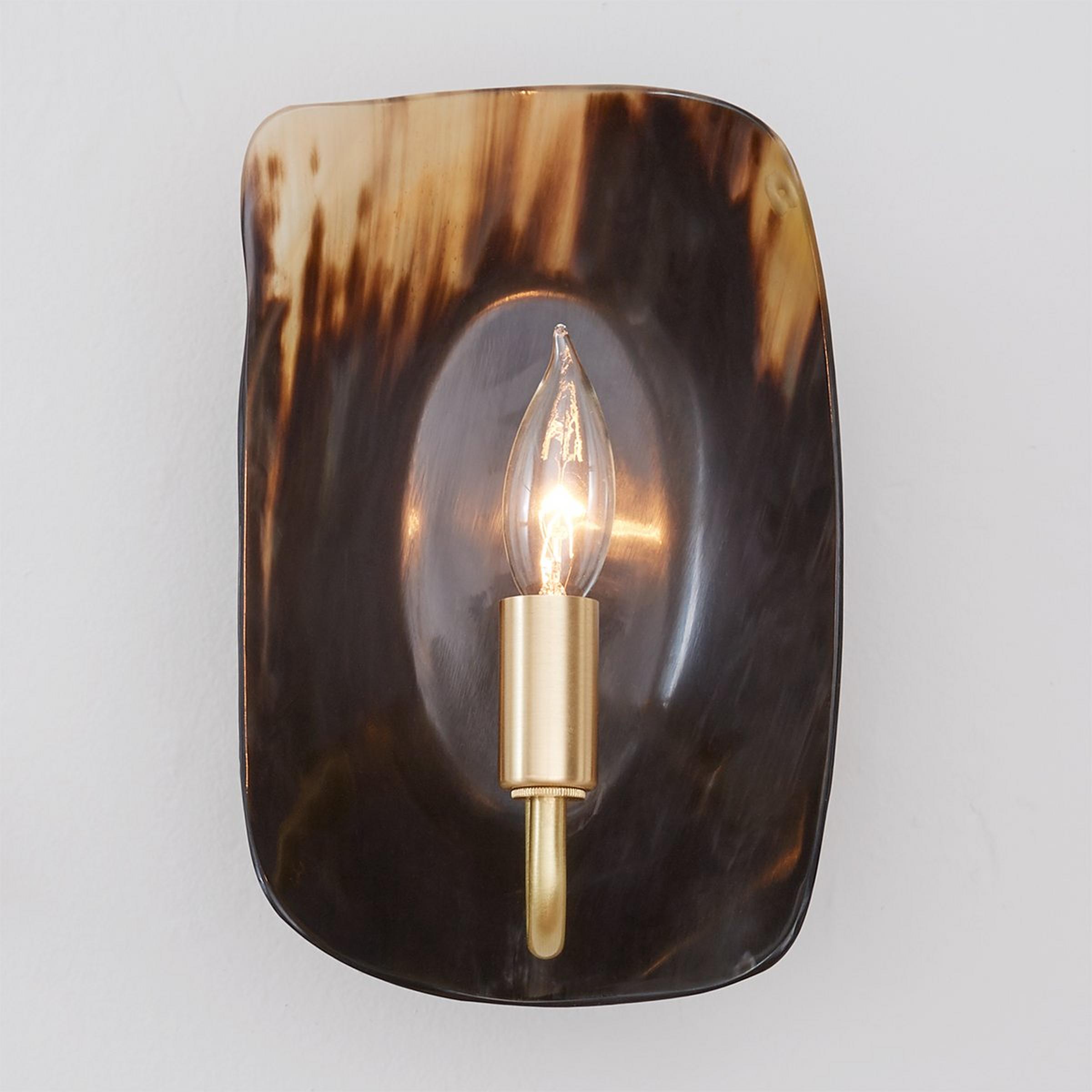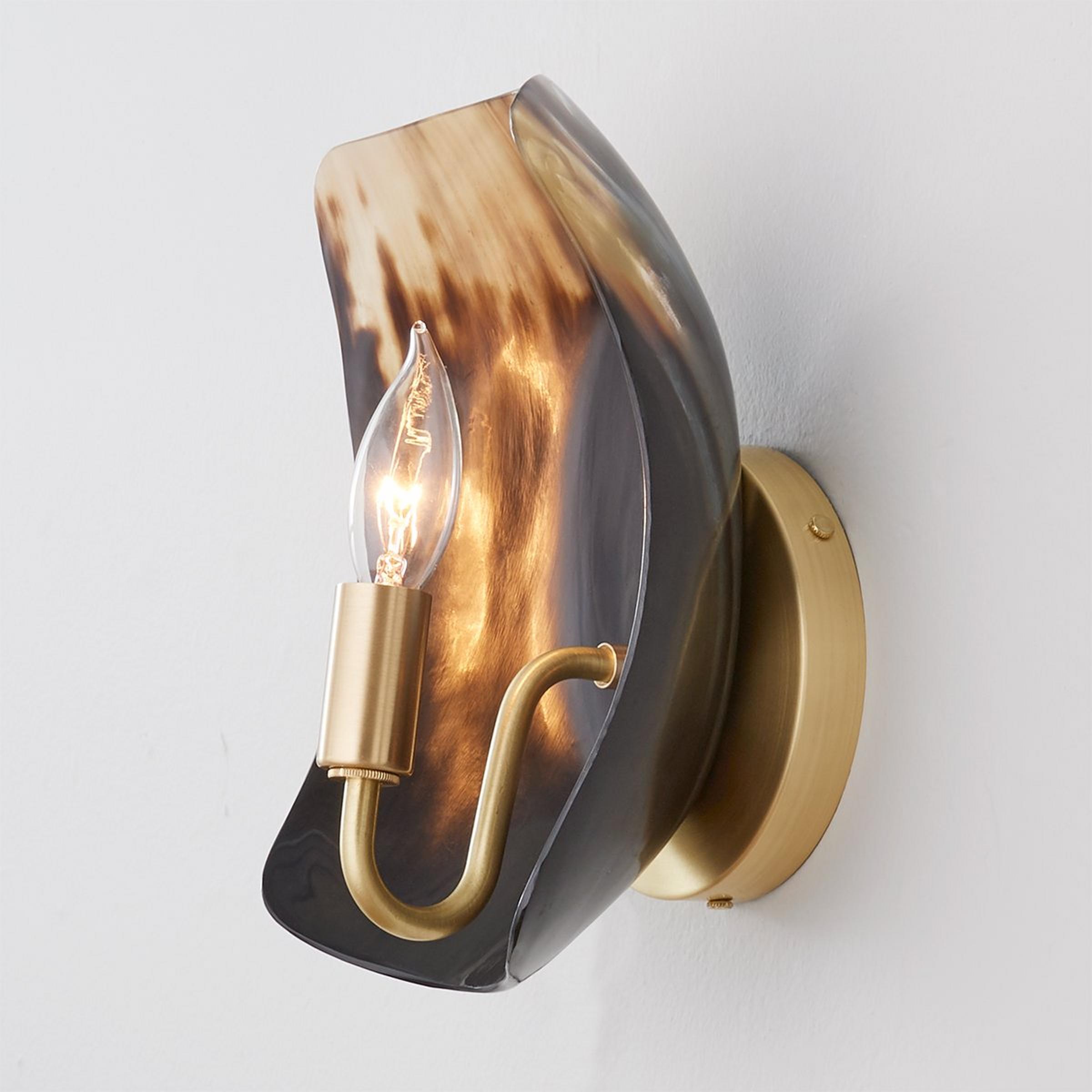 Polished horn is illuminated in this modern, yet rustic sconce, perfect for adding a natural touch to a modern space, or completing a masculine living room. This sconce is assembled by hand in our Richmond, Virginia production facility using solid brass hardware. Due to the nature of using an organic product no two will be exactly alike in color, shape, or pattern.