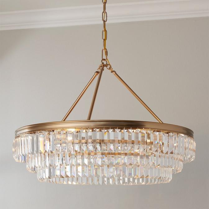 Contemporary and elegant, three layers of faceted rectangular crystals cascade down a metallic frame, giving this chandelier a sophisticated air. This striking centerpiece makes an elegant dining room chandelier.
