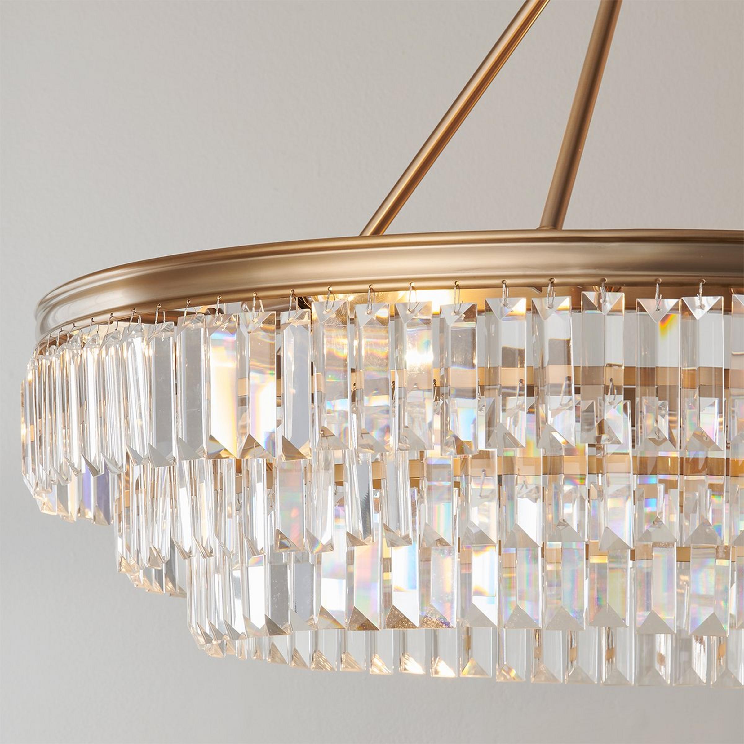 Contemporary and elegant, three layers of faceted rectangular crystals cascade down a metallic frame, giving this chandelier a sophisticated air. This striking centerpiece makes an elegant dining room chandelier.