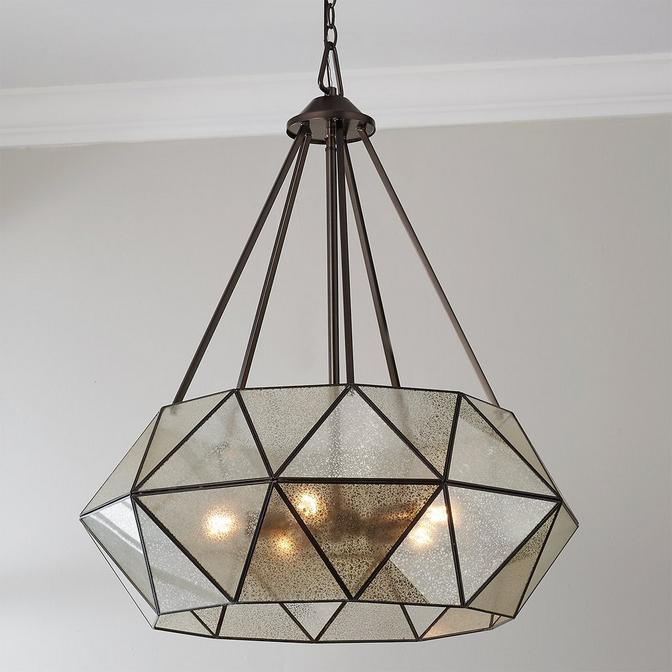 This super stylish chandelier shows off a gorgeous geometric frame with triangular panes of mercury glass. The imperfect nature of mercury glass coupled with the bronze frame make this fixture a versatile piece perfect for rustic, modern, transitional, and eclectic spaces.