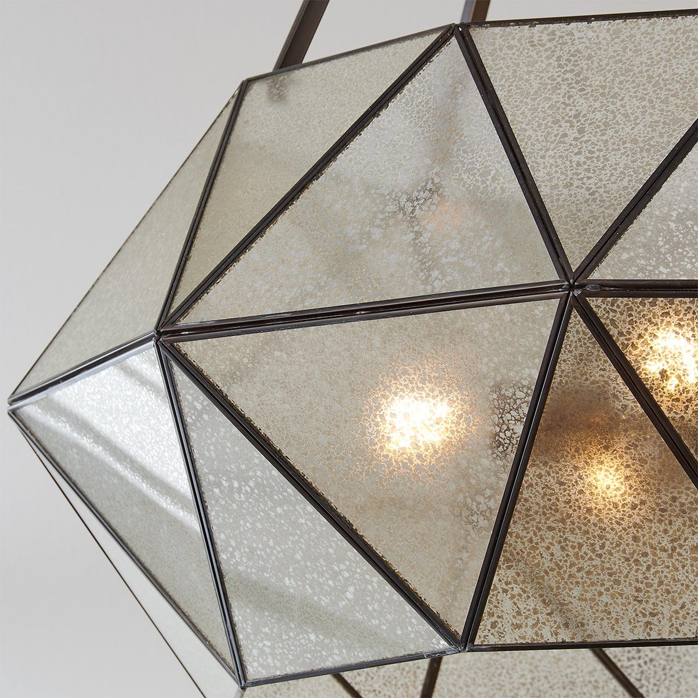 This super stylish chandelier shows off a gorgeous geometric frame with triangular panes of mercury glass. The imperfect nature of mercury glass coupled with the bronze frame make this fixture a versatile piece perfect for rustic, modern, transitional, and eclectic spaces.
