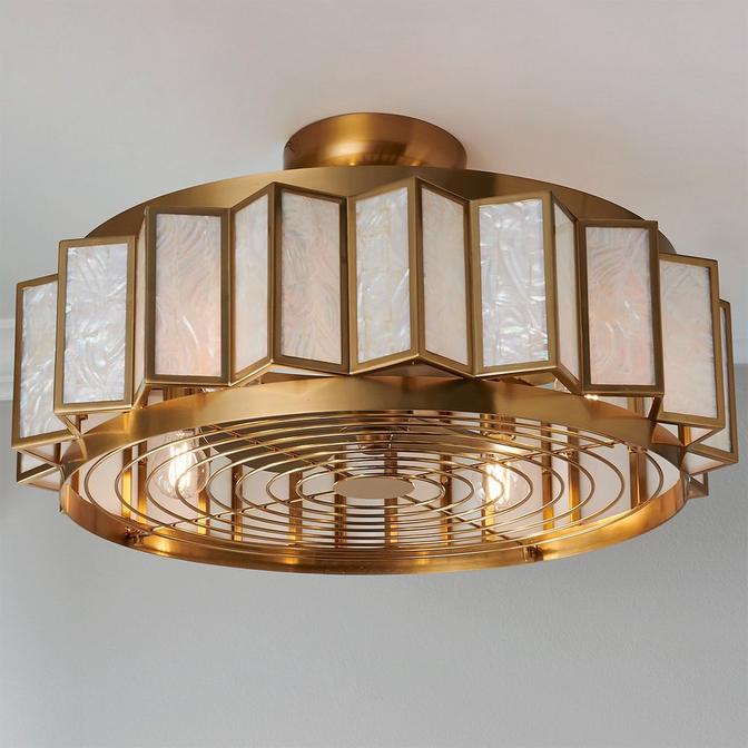 Consisting of luxurious materials like natural capiz shell shades, this fixture mixes organic with geometric for a dazzling impact. Angular squares protrude from a central ring which resembles a multi pointed star when viewed from below. Metal fan blades nestle inside and displace air comfortably.