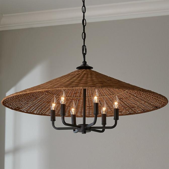 Clean lines and minimalist features define the Rattan Shade Chandelier. This gorgeous fixture boasts an empire rattan shade over top a minimalist cluster of lights, providing ambient downward lighting to a focused space of your choice. This chandelier will definitely stand out over top of your dining table!