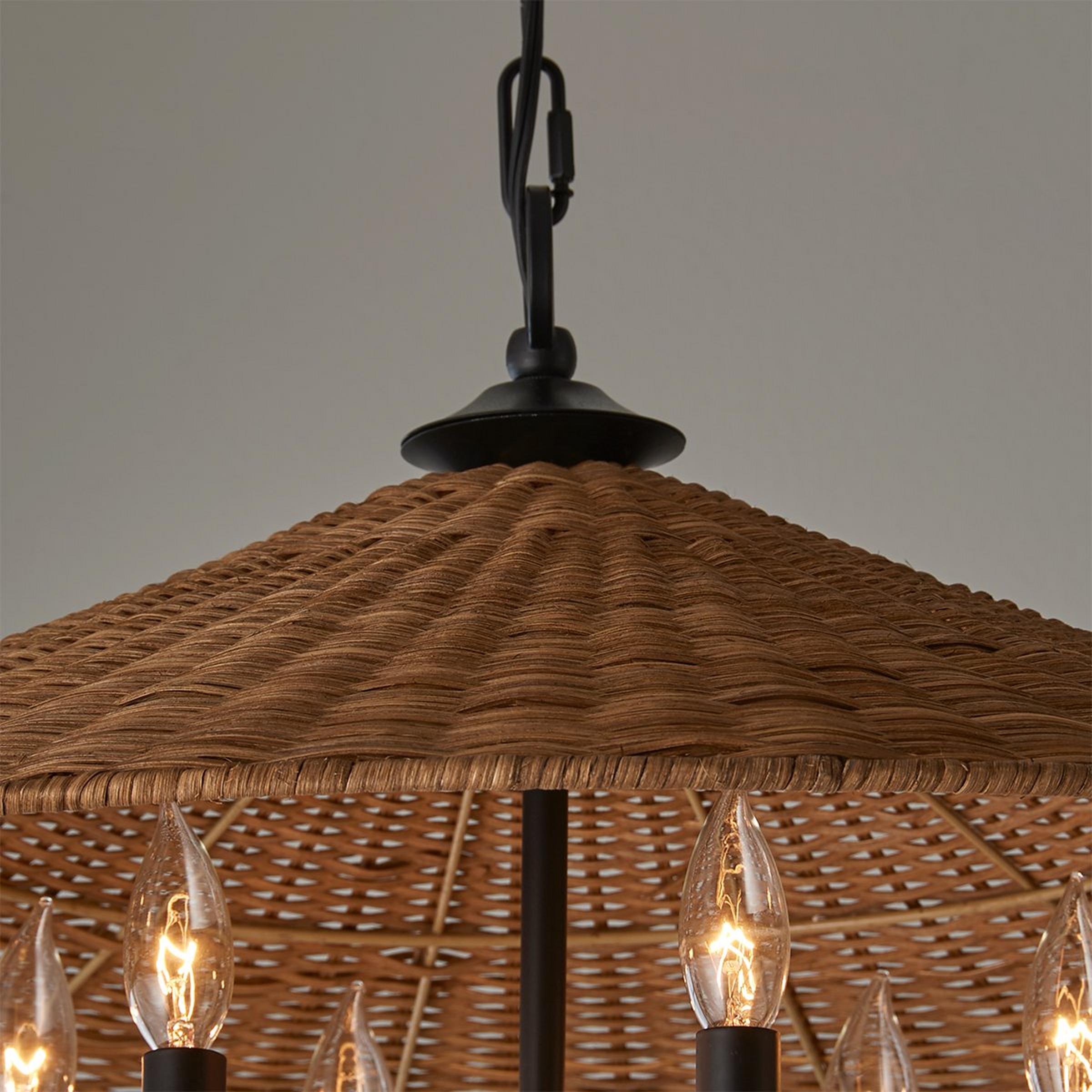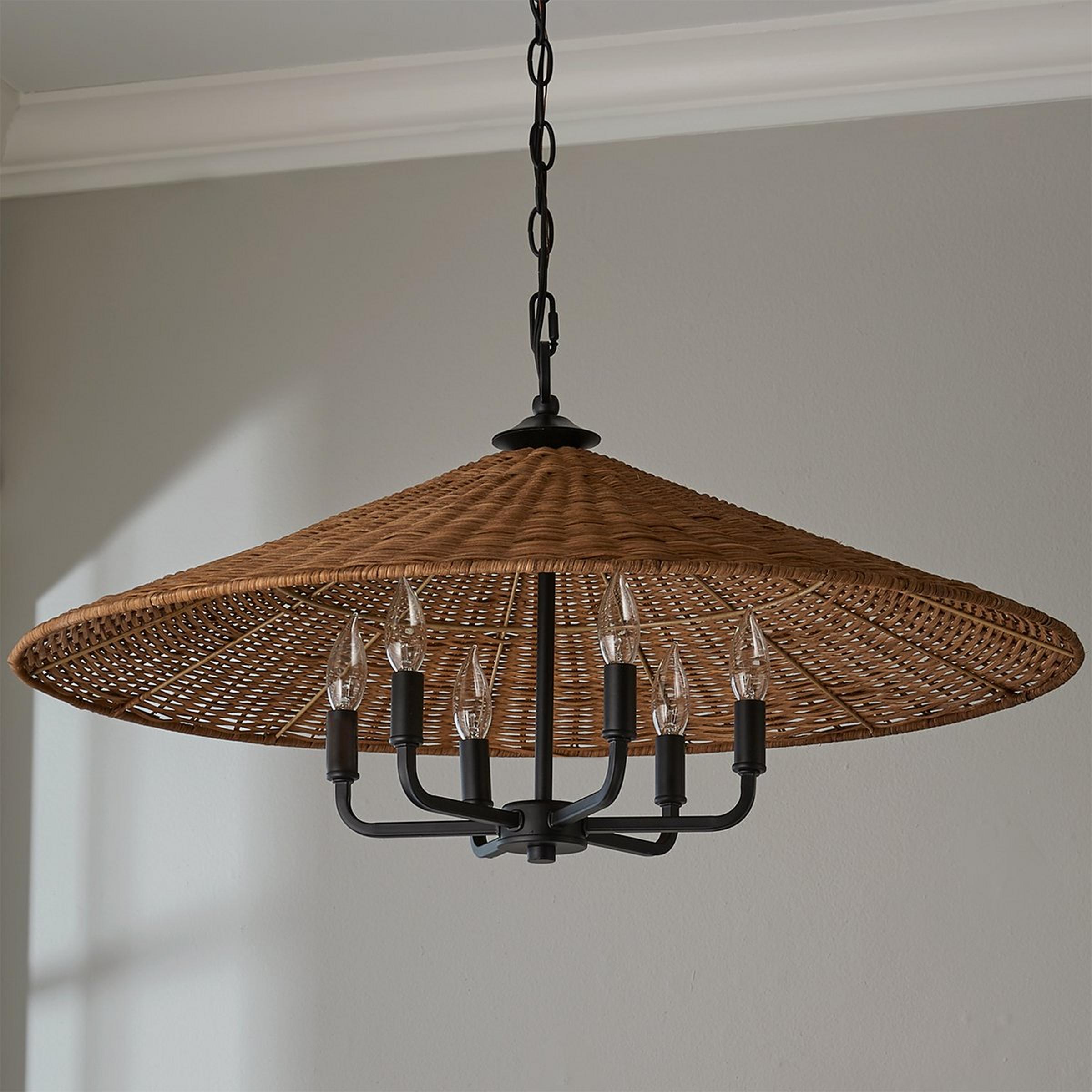 Clean lines and minimalist features define the Rattan Shade Chandelier. This gorgeous fixture boasts an empire rattan shade over top a minimalist cluster of lights, providing ambient downward lighting to a focused space of your choice. This chandelier will definitely stand out over top of your dining table!