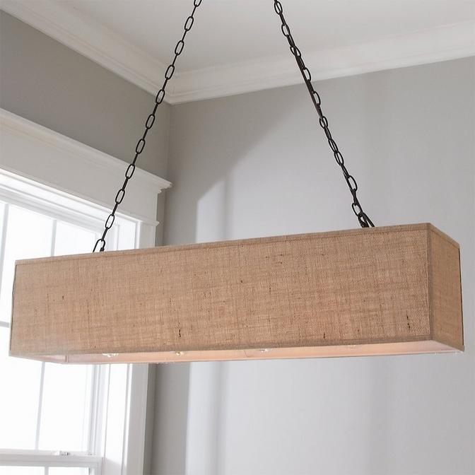 This rectangular chandelier offers a unique and fresh way to light kitchen islands, farm tables, and pool tables. Our exclusive rectangular shade in burlap or linen really makes a trend statement and does the lighting job as well!