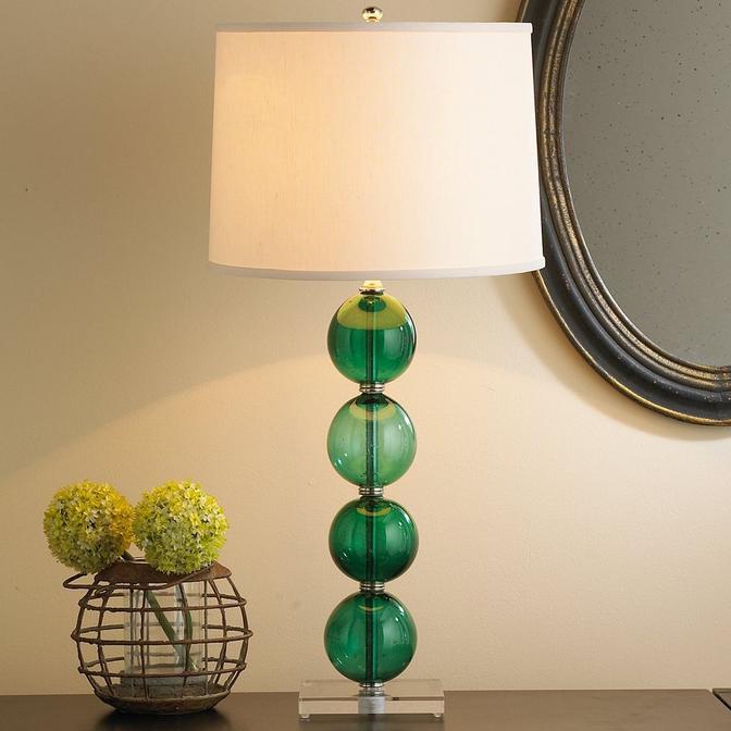 Four spheres of hand blown recycled glass are elegantly poised atop a clear acrylic base. The slightly-seeded glass ball column is accented with polished nickel hardware and topped with a linen drum shade. Authentic hand blown glass variations in color and clarity grace this table lamp with character. Destined to be an instant classic! The Clear recycled glass globes have greenish blue tones.