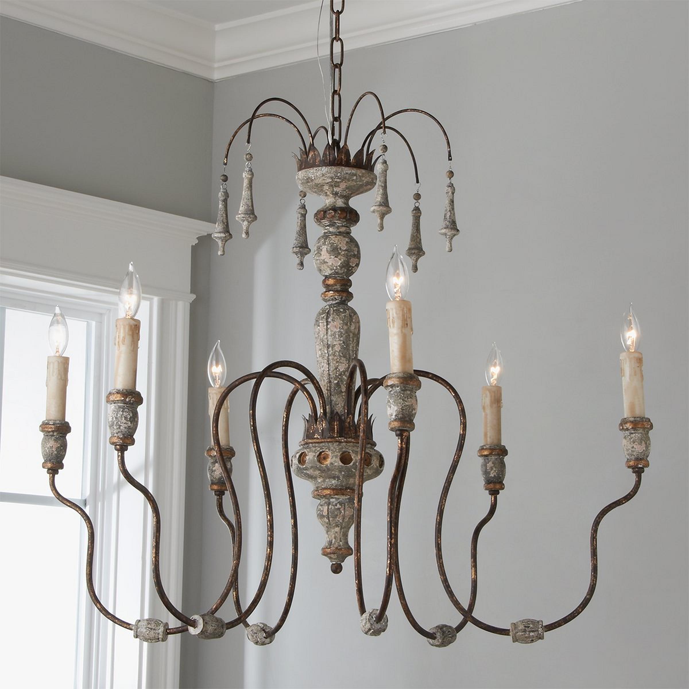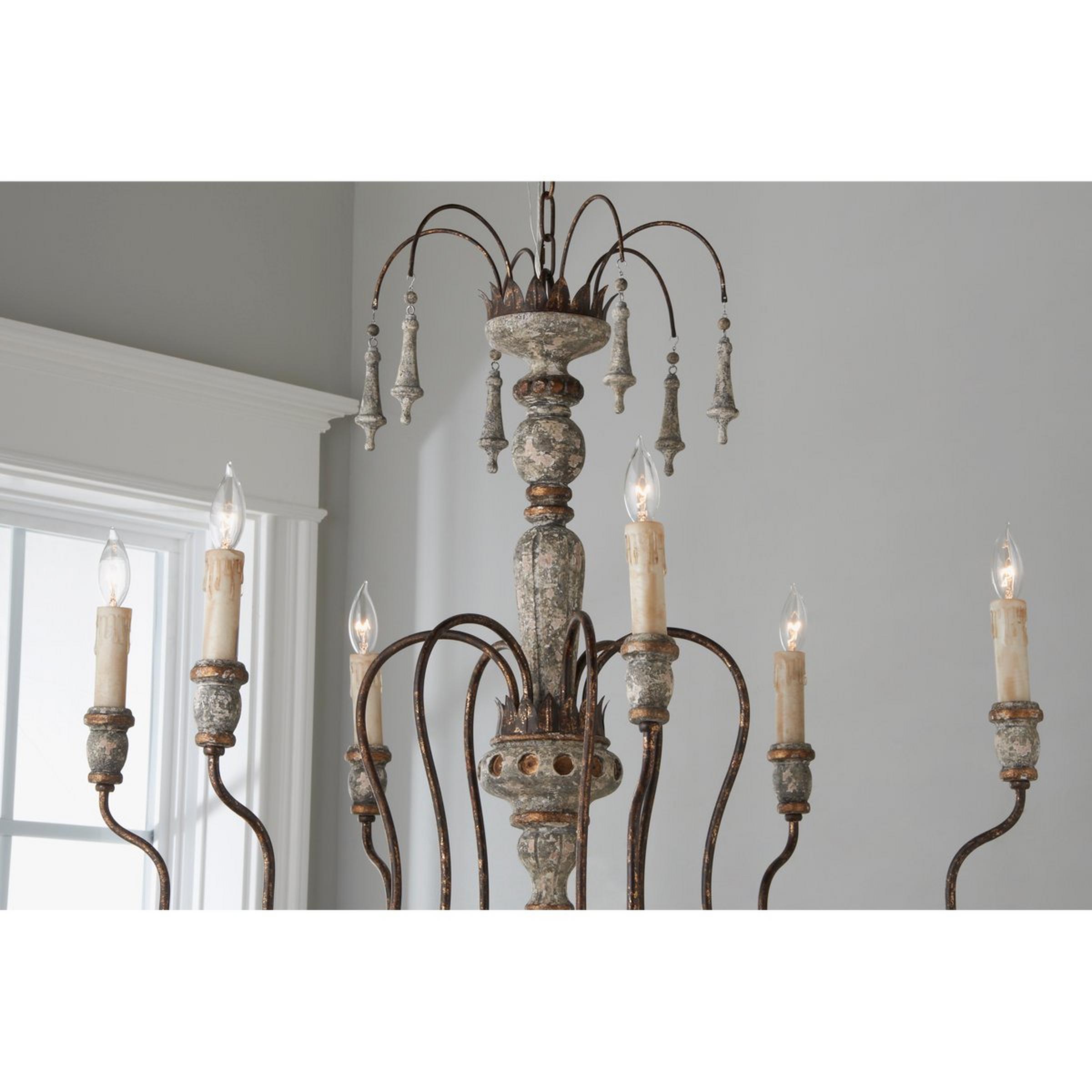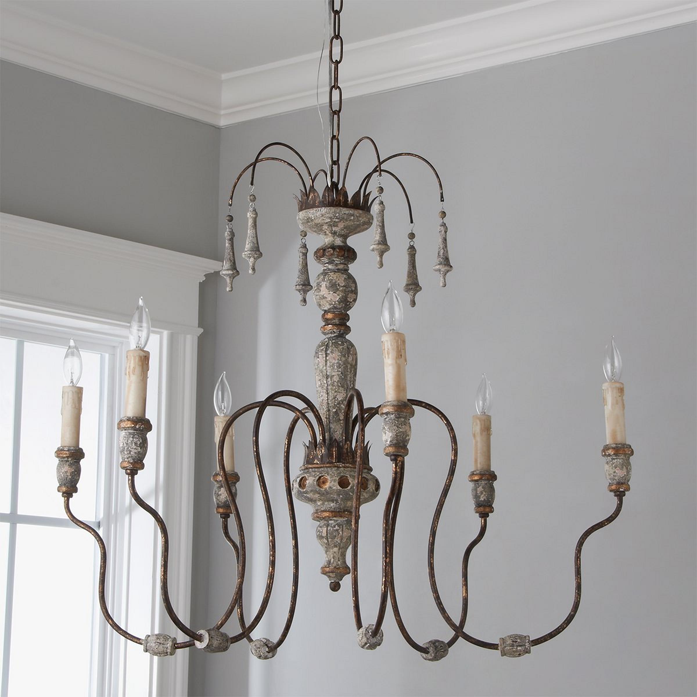 A beautiful spindle arm chandelier with faux drip candle covers and a distressed French White and Gold finish over wood and iron. An excellent addition to a grand foyer or dining room, living room or bedroom with tall ceilings. Please use 25 watt (incandescent) or equivalent LED bulbs if used with optional chandelier shades. Check out our shades and add an elegant touch to this chandelier.