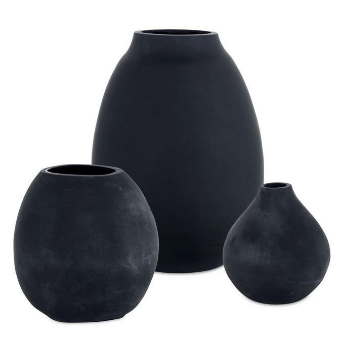 Sleek and understated, this Regine vase set features a smooth matte black finish that complements modern and minimalist interiors. Its clean silhouette makes it ideal for showcasing fresh blooms or standing alone as a striking sculptural accent. Perfect for adding contrast to light, neutral spaces. Measurements: Small-5x6x5, Medium-7x7x7, Large-9x12x9