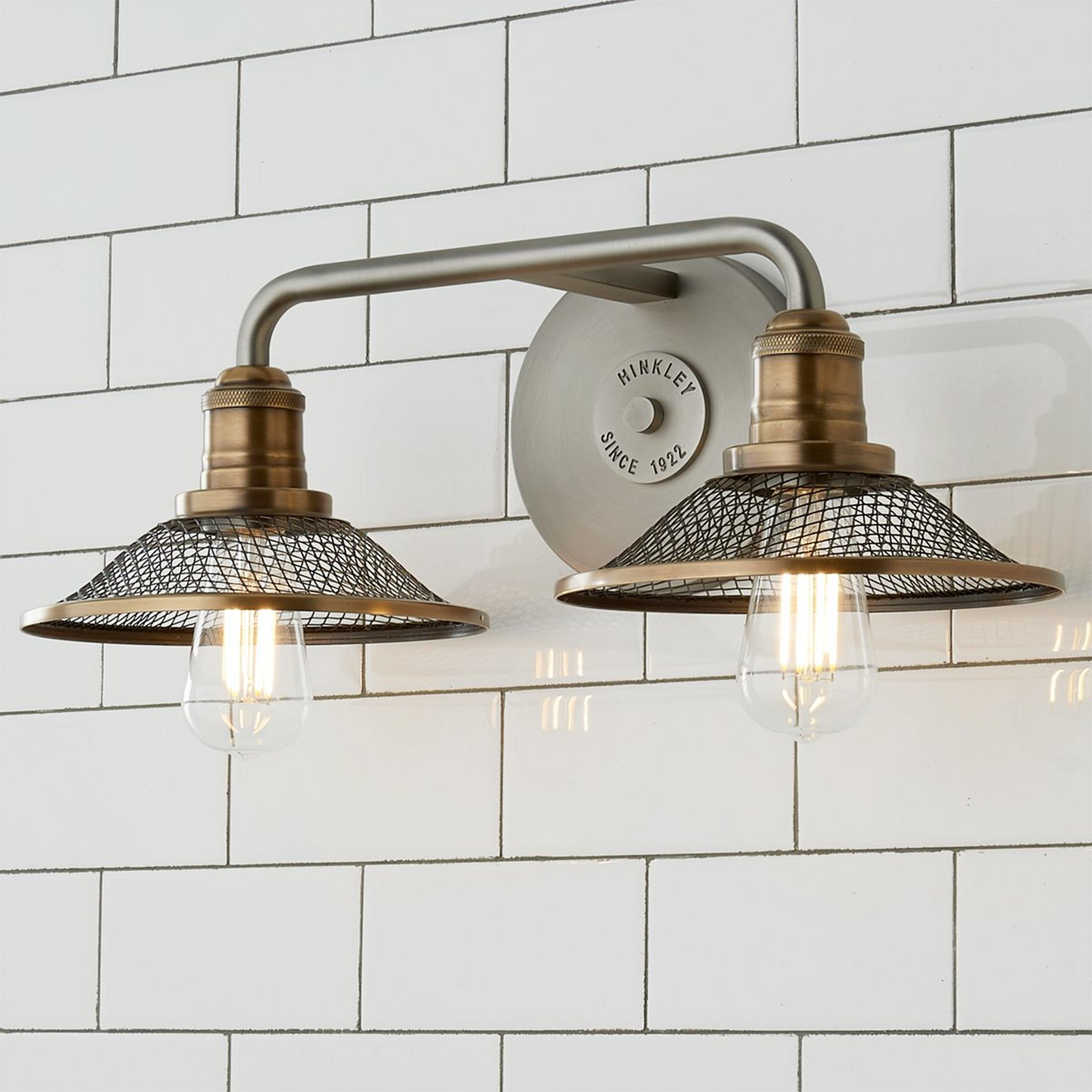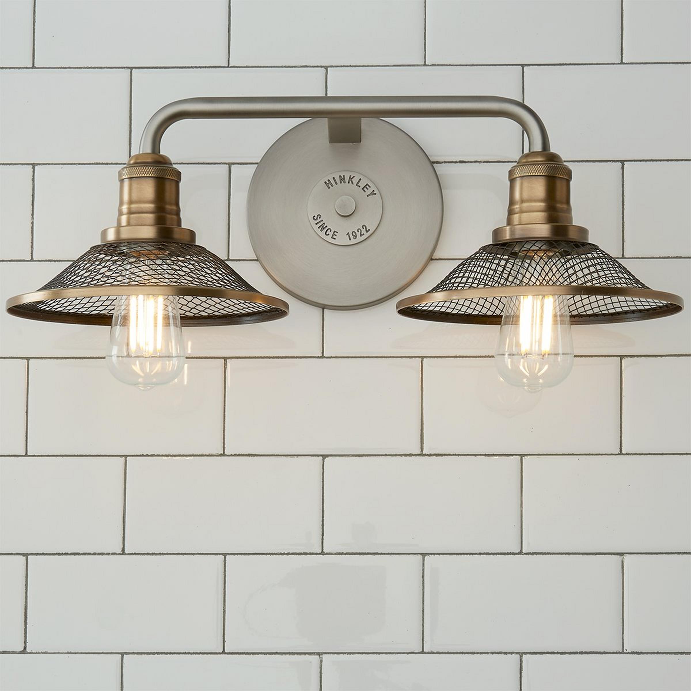 The classic shape of this bath light pairs with beautiful retro details like an open mesh shade, a sleek industrial socket, and an elegantly simple backplate. The result is a stylish fixture with hints of modern trends wrapped in a timeless appeal. Decorative stamped plate is reversible.