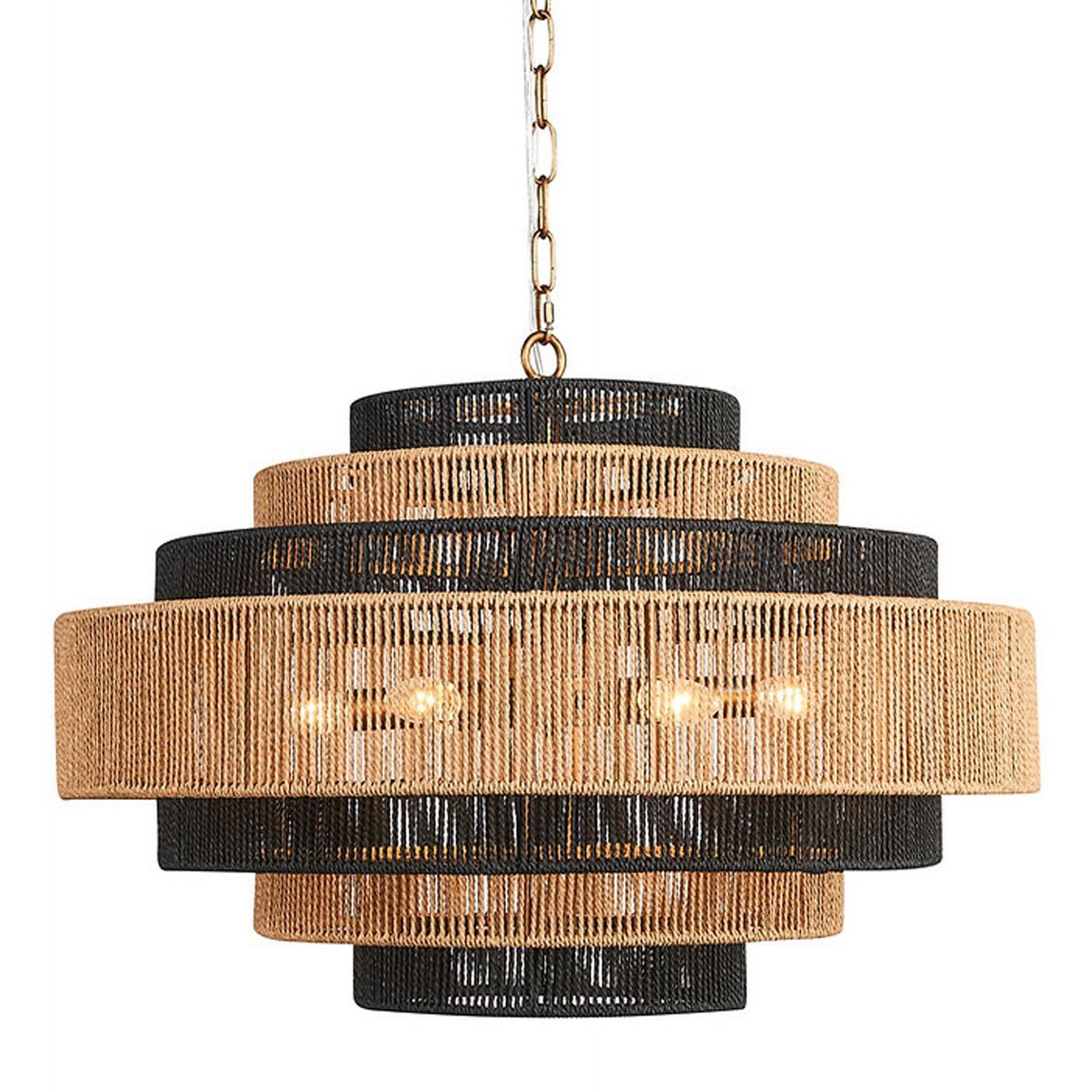 Rhodes is an opulent chandelier that utilizes layers of rattan drum shades, featuring an alternating color scheme to assemble a unique look. The radial hardware underneath peeks through the intricate weave, illuminating your space and elevating your style!