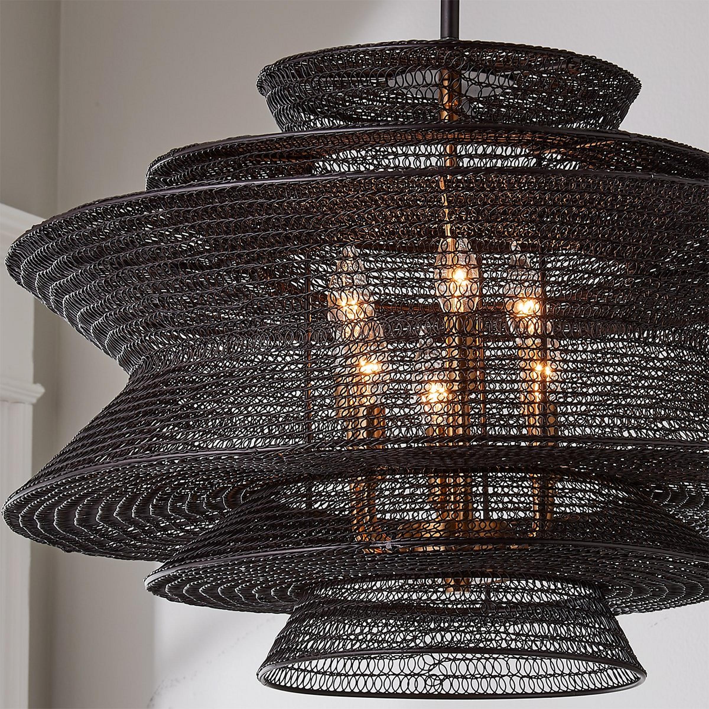 The striking shade of this modern lantern is shaped in a dramatic ripple pattern. The mesh shade is finished in a dark Bronze that helps this eye-catching fixture transition from modern and contemporary spaces to rugged industrial ones.