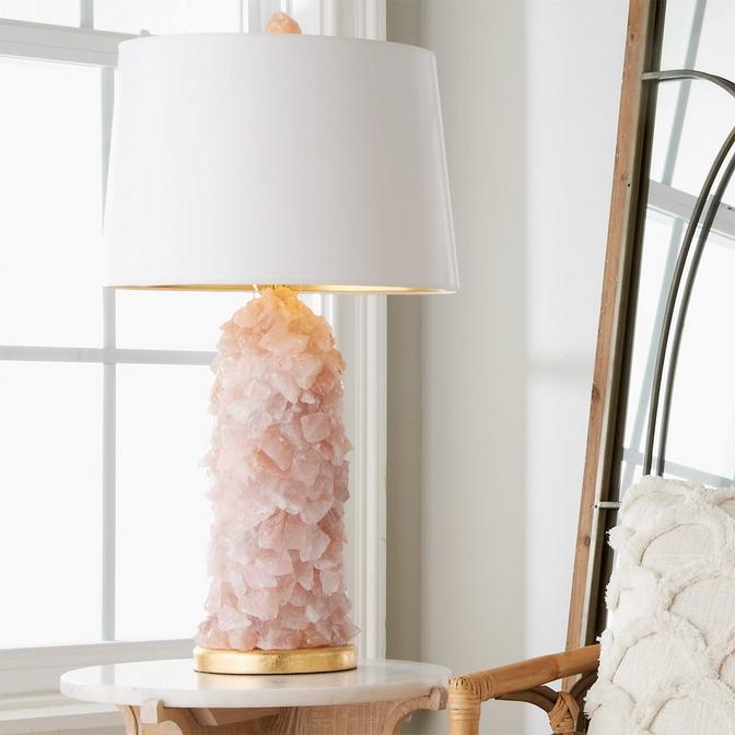 This handcrafted table lamp is a true work of functional art! Each lamp is made with a handcrafted base that is meticulously finished by hand in gold leaf and each stone is then placed by hand by one of our trained artisans. Available in semiprecious rose quartz, this tumbled stone table lamp adds an elegance that only nature's colors can offer. Topped with a white paper shade lined with gold foil lining. Proudly made in America! Due to the handcrafted nature of this product and the natural size and color variation of the stone, no two will be exactly alike in shape, size, or color.