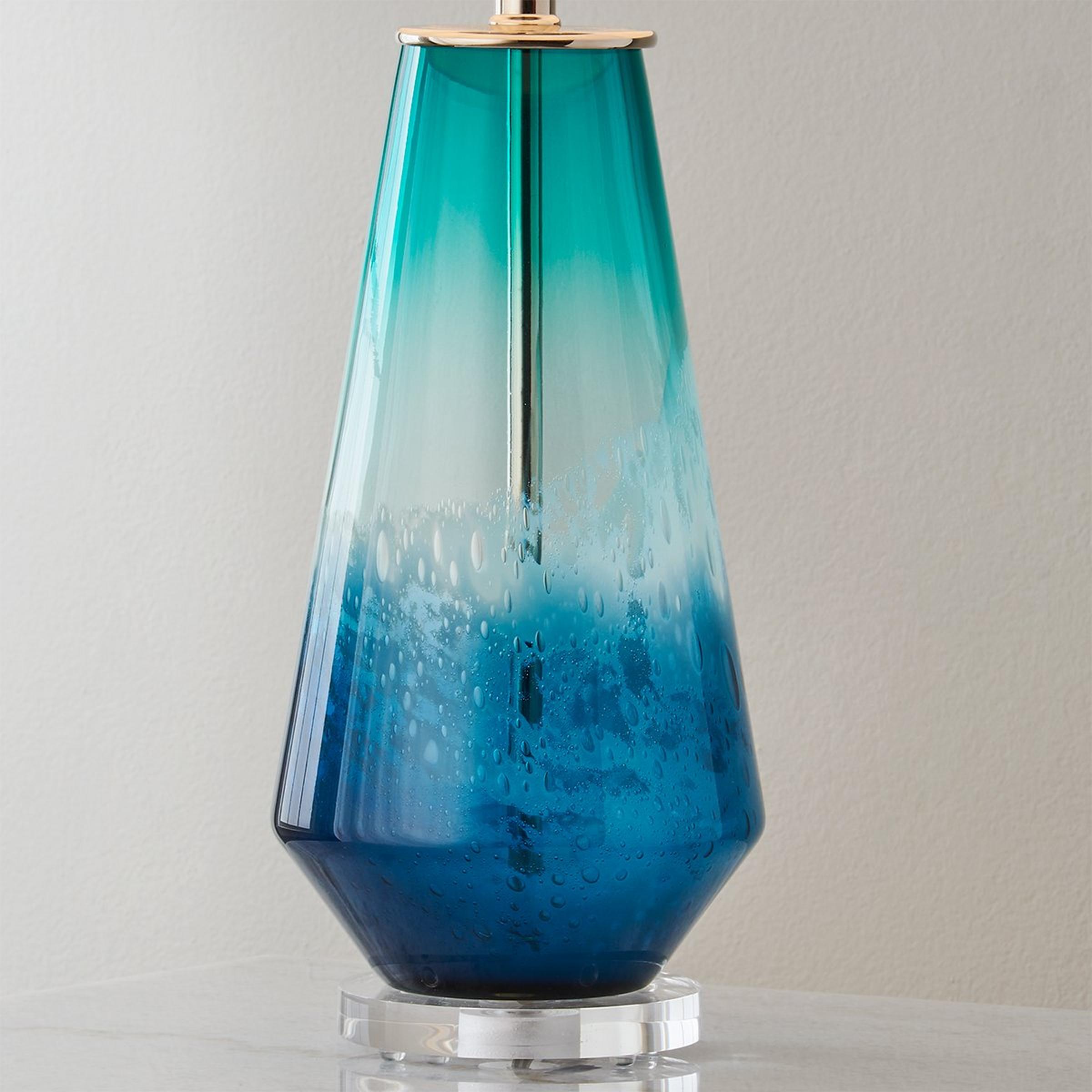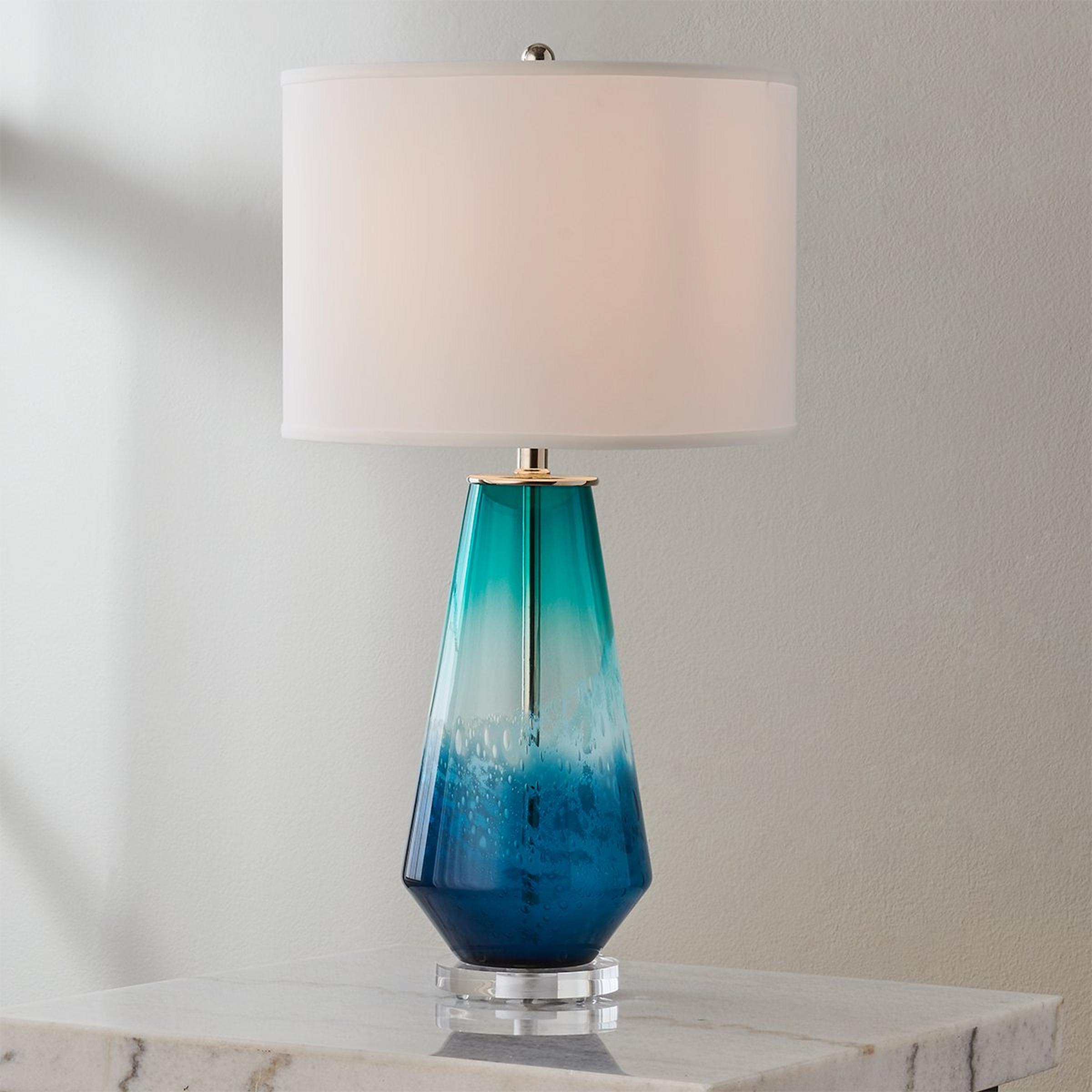 The Rockland Table Lamp captures the untamed beauty of the sea, bringing a touch of coastal elegance to your space. Its acrylic base provides a sleek foundation, while the striking tapered art glass- swirling in shades of blue, green and white- mimics the dynamic motion of the a rough sea. Topped with a crisp white pongee drum shade, this lamp offers a perfect blend of artful design and soft illumination, making it a stunning focal point in any room. Please note that due to the nature of art glass, differences in color, texture and pattern should be expected and celebrated; no two fixtures will be exactly alike, adding to the unique nature of the table lamp. This lamp is assembled by hand in our Richmond, Virginia production facility.