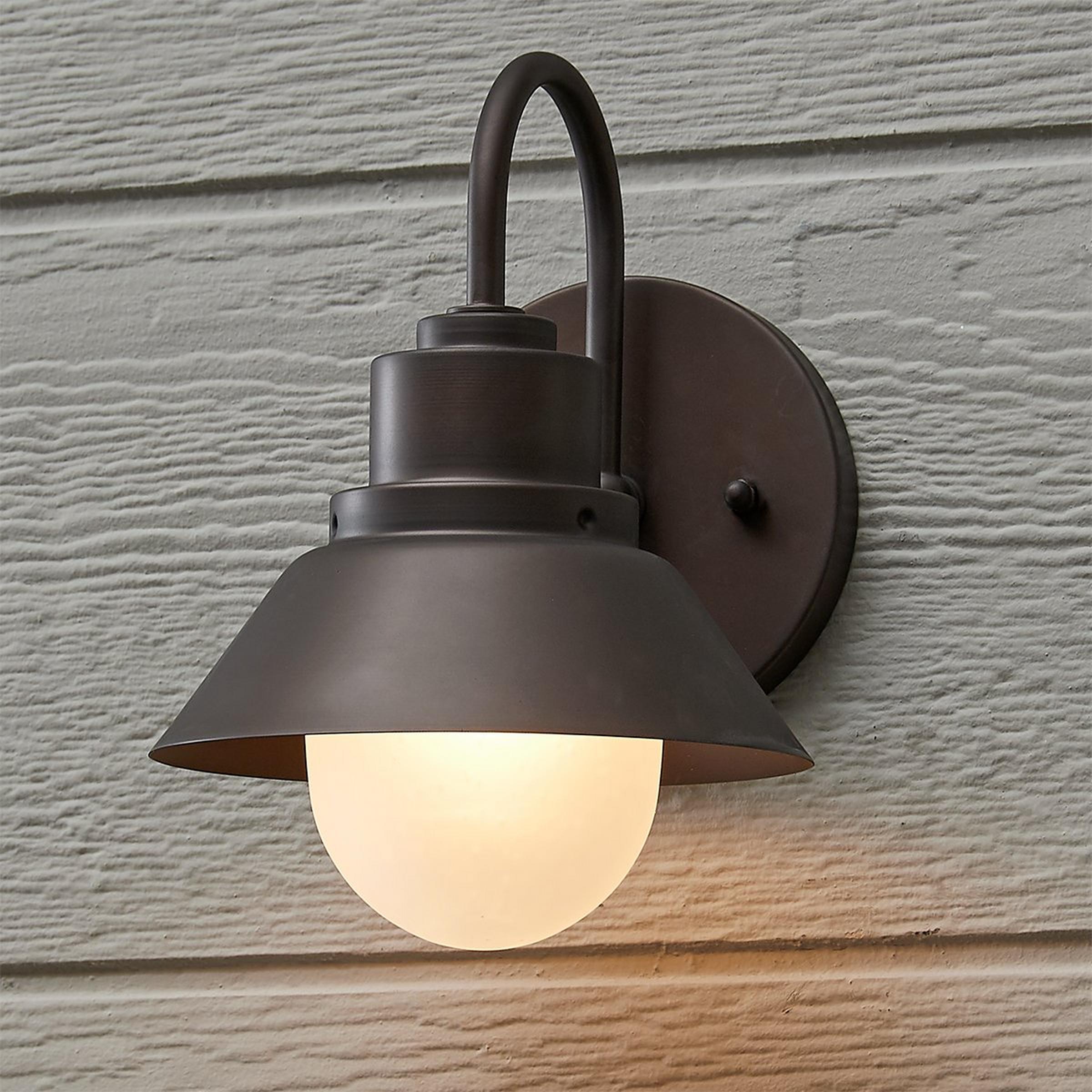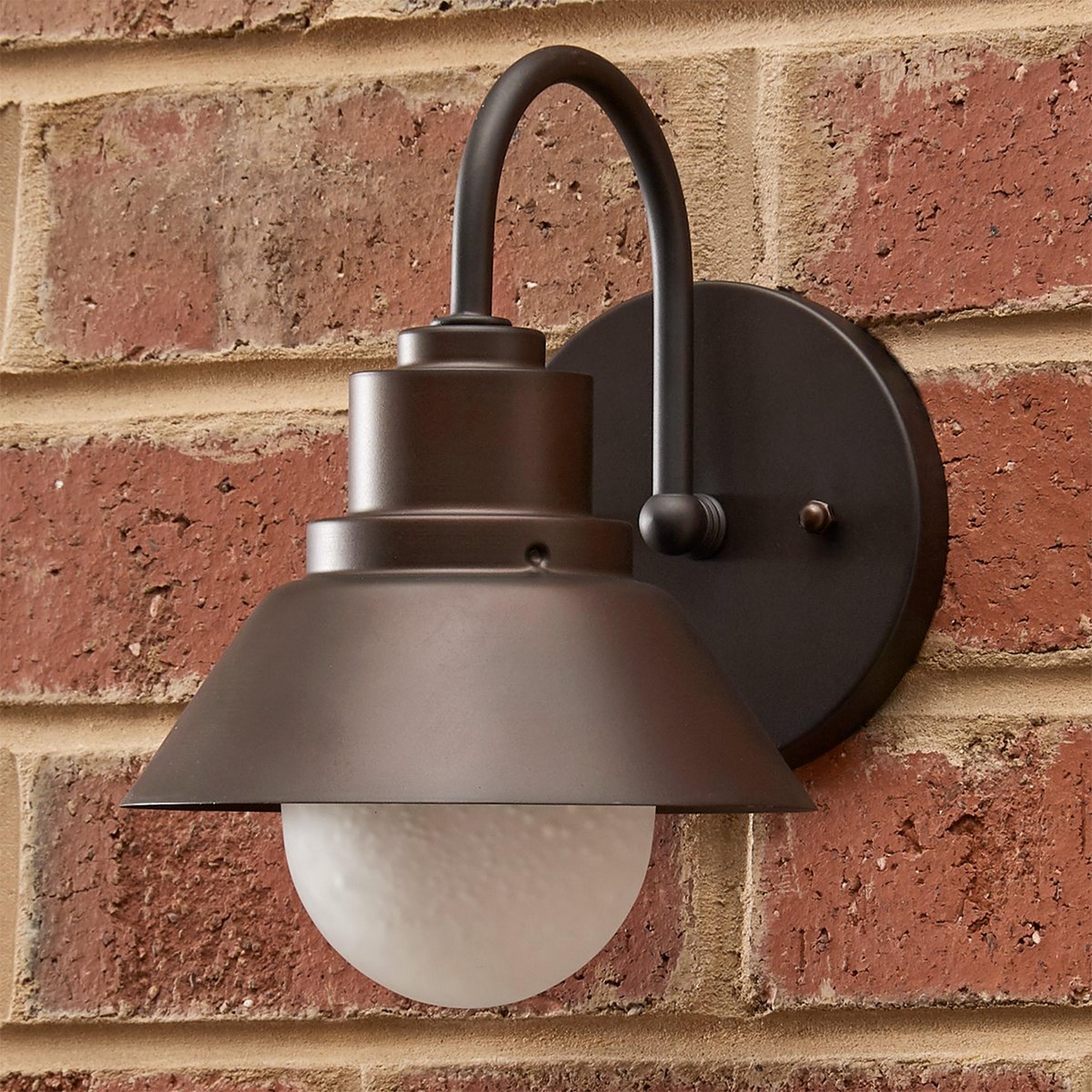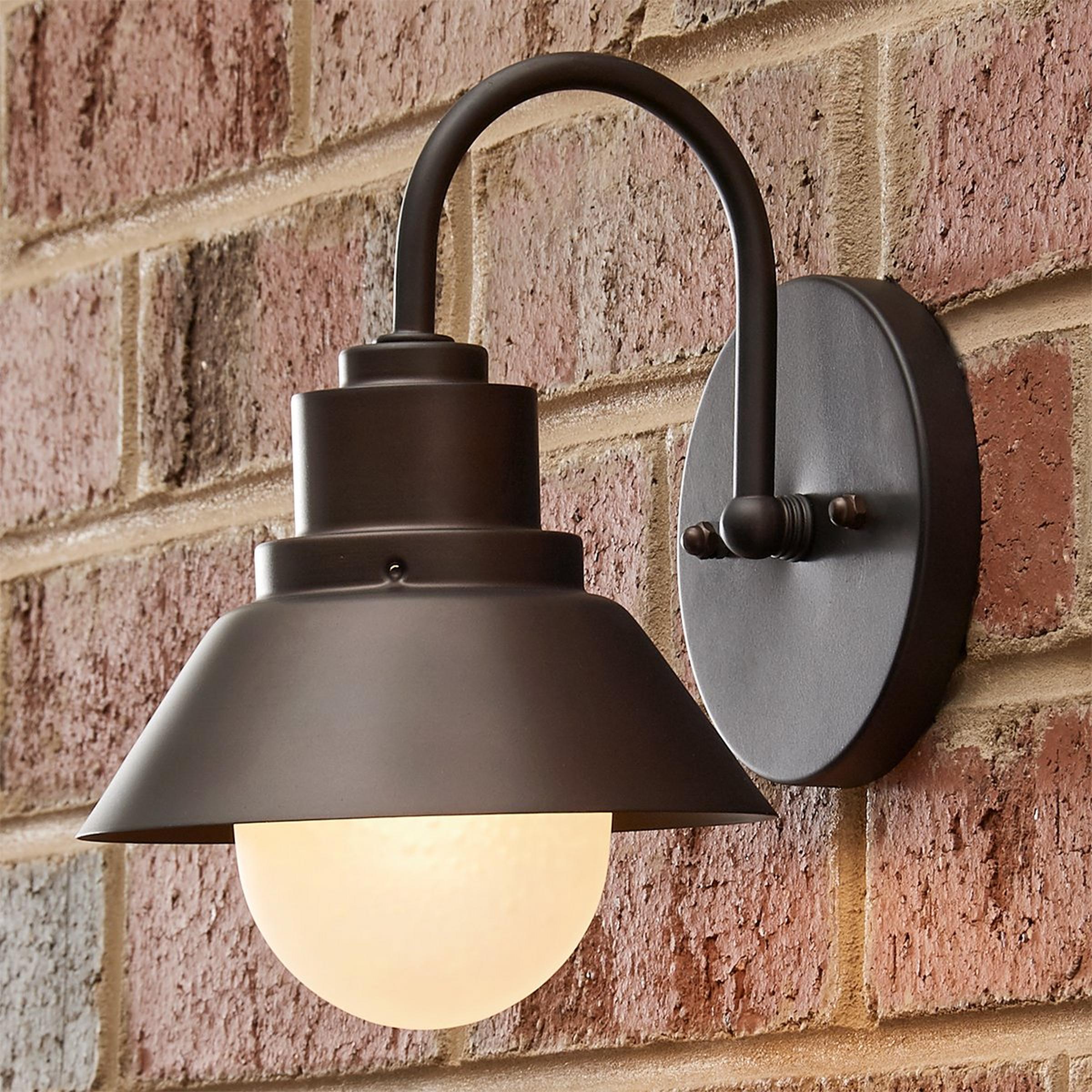 A round metal shade, a gooseneck arm and frosted glass globe, with slight seeding shining through, unite to form an industrial or charming cottage-style sconce perfect for interior or exterior spaces. 4.25" height to center.