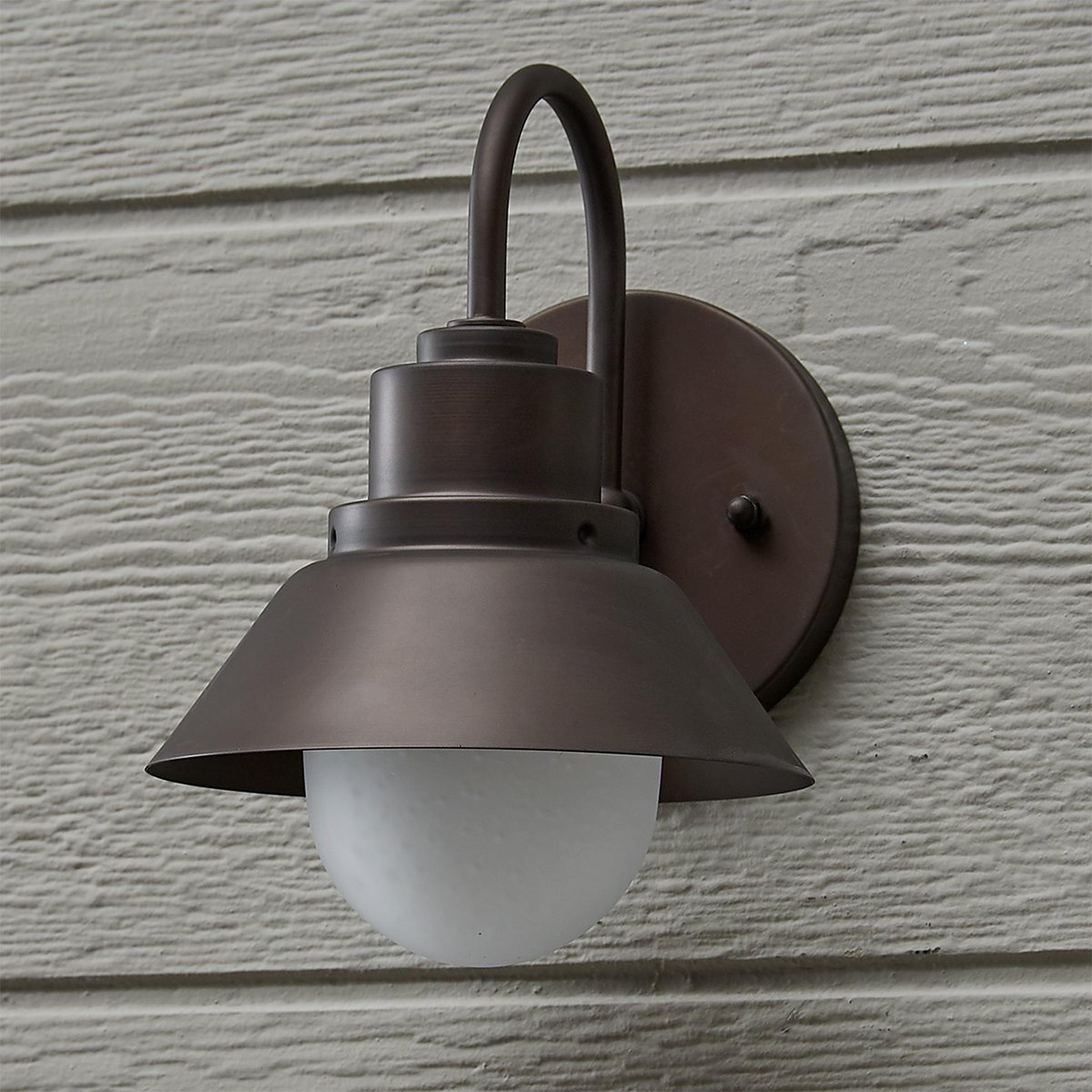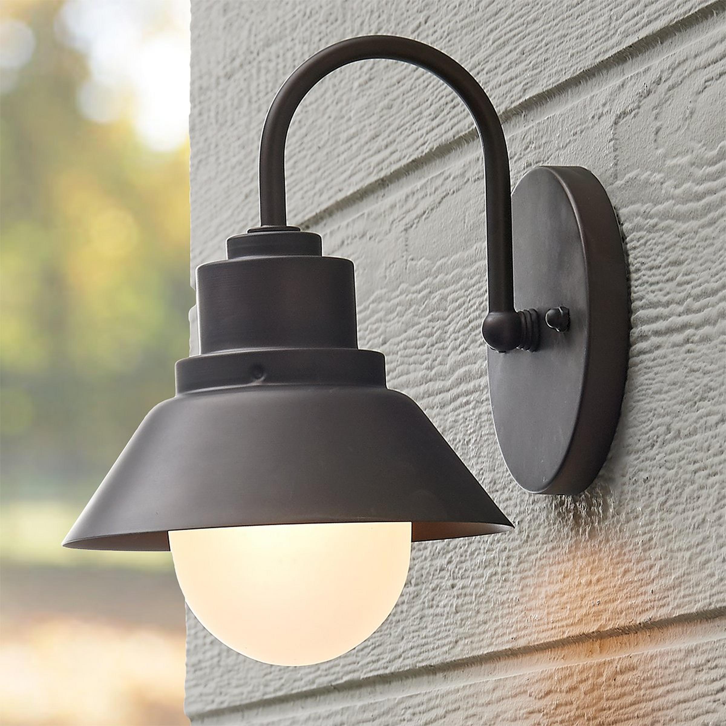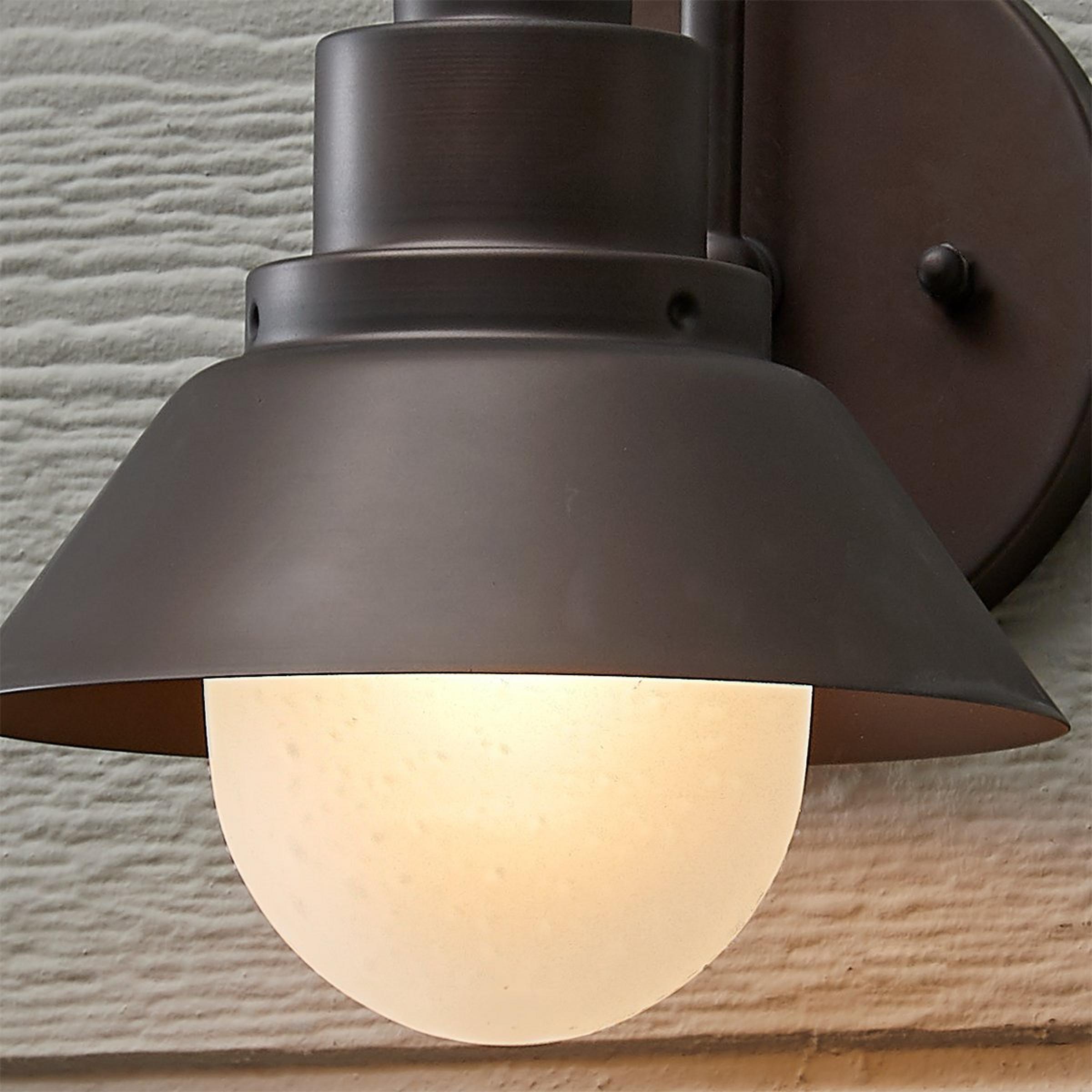 A round metal shade, a gooseneck arm and frosted glass globe, with slight seeding shining through, unite to form an industrial or charming cottage-style sconce perfect for interior or exterior spaces. 4.25" height to center.