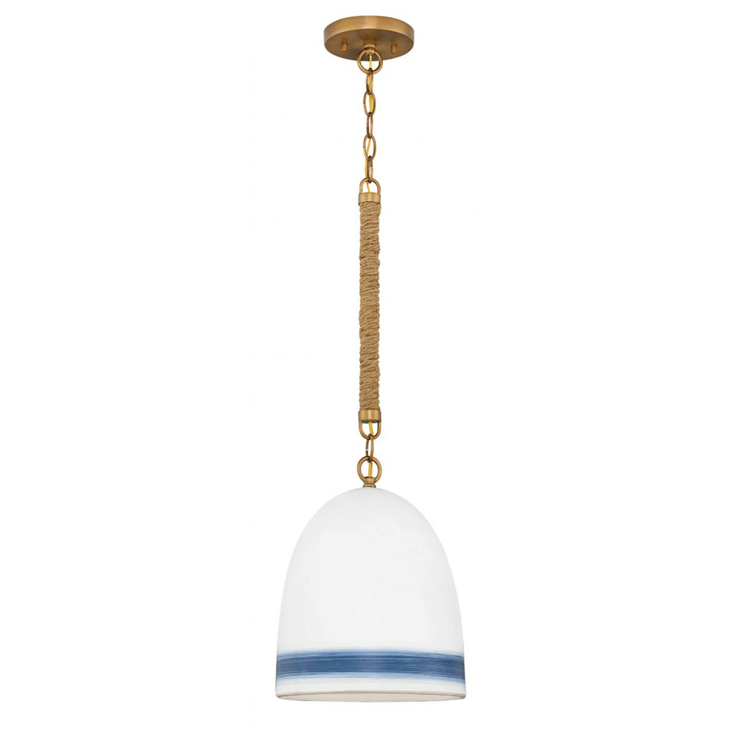 Ideal for adorning your kitchen island, the Rope Wrapped Pendant adds a coastal charm to your space! Thick jute provides a beautiful and organic contrast to the metallic chain, enhancing the nautical motifs. Each ceramic shade is hand-painted with a splash of color, creating a fresh ambiance with ease. Due to the nature of the ceramic, colors, intensity, and sizing of the stripe may vary.