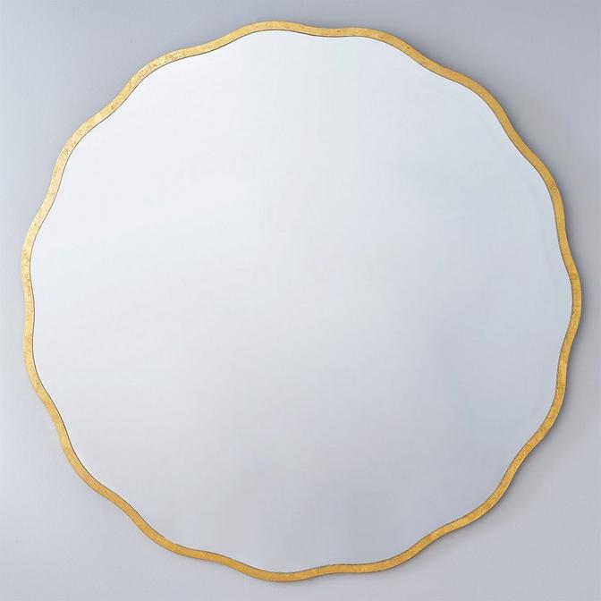The Gilded Scallop Mirror, with its undulating gold frame and beveled edge, radiates elegance and femininity. Ideal for a bedroom, its distinctive profile inspires beauty and serves as a captivating focal point in any modern, transitional, or traditional home.