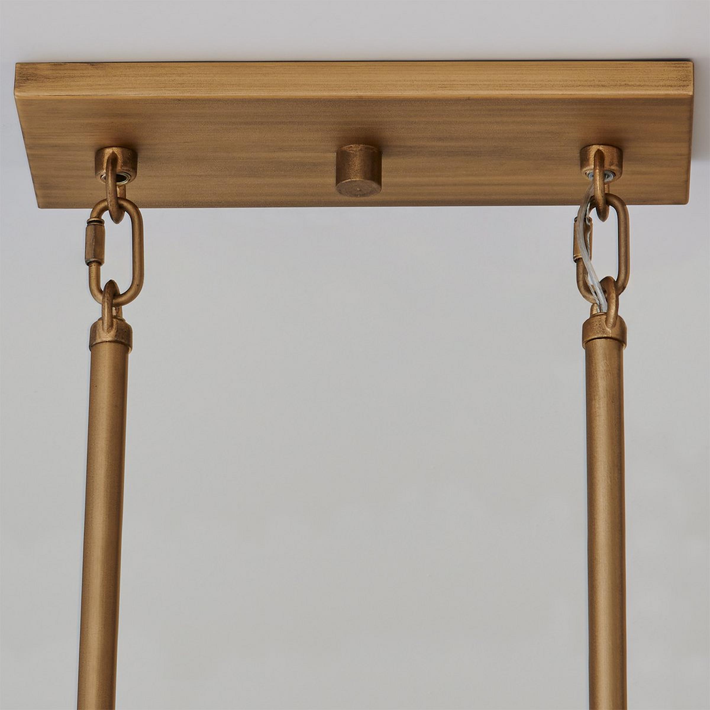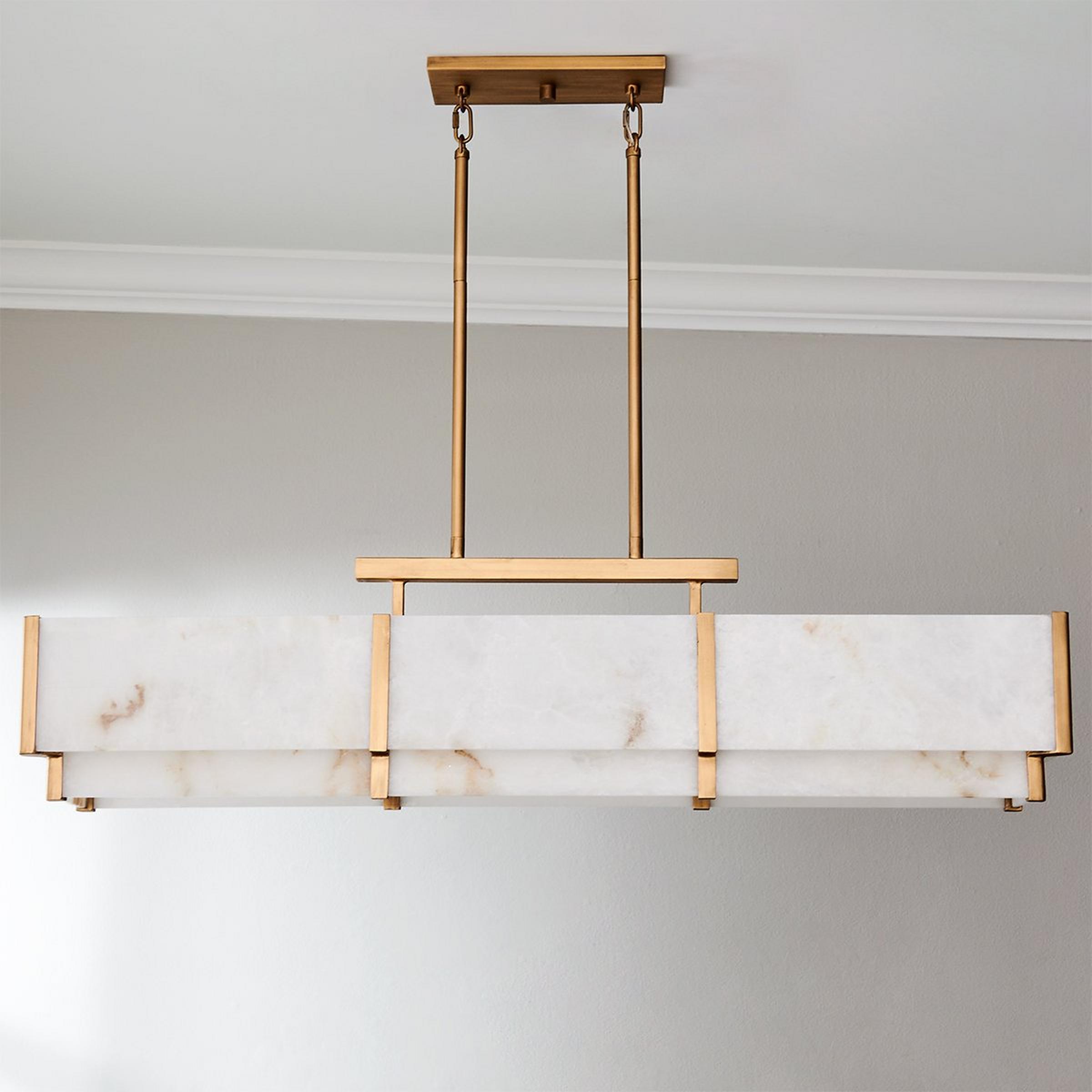 The Ruben island chandelier commands attention with its elongated silhouette and alabaster panels, softly diffusing light across its linear span. The two-tier alabaster panels offer a quiet glow, balancing elevated function with minimalist refinement. The simple metal frame and bold sculptural panes craft a focal point that’s both modern and inviting. Ideal for kitchen islands or dining tables, this fixture delivers luxury with understated drama. Ruben is a natural fit for a variety of tailored spaces.