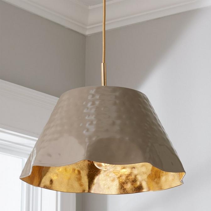 A Shades of Light exclusive, you won't find this one-of-a-kind pendant light anywhere else! The ruffled edge shape can go from dainty to modern depending on the surrounding decor. All have a gold leaf-look interior.
