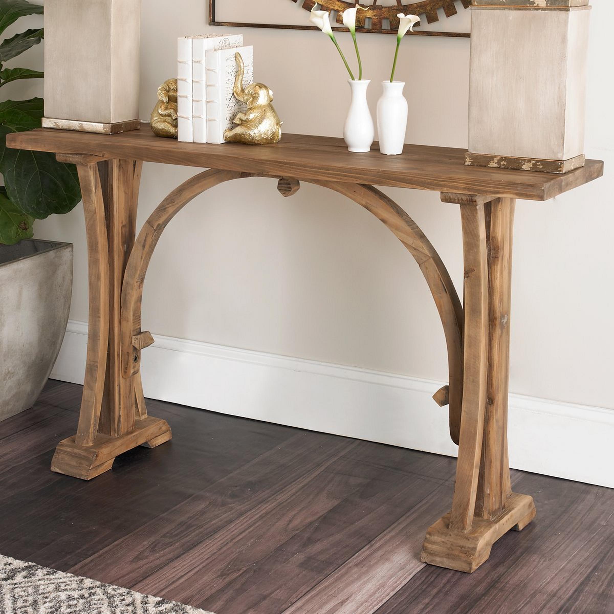 The arched details give this console table a hint of Gothic flair combined with a rustic feel from the solid reclaimed fir wood in a sun bleached finish with a light antiquing glaze.