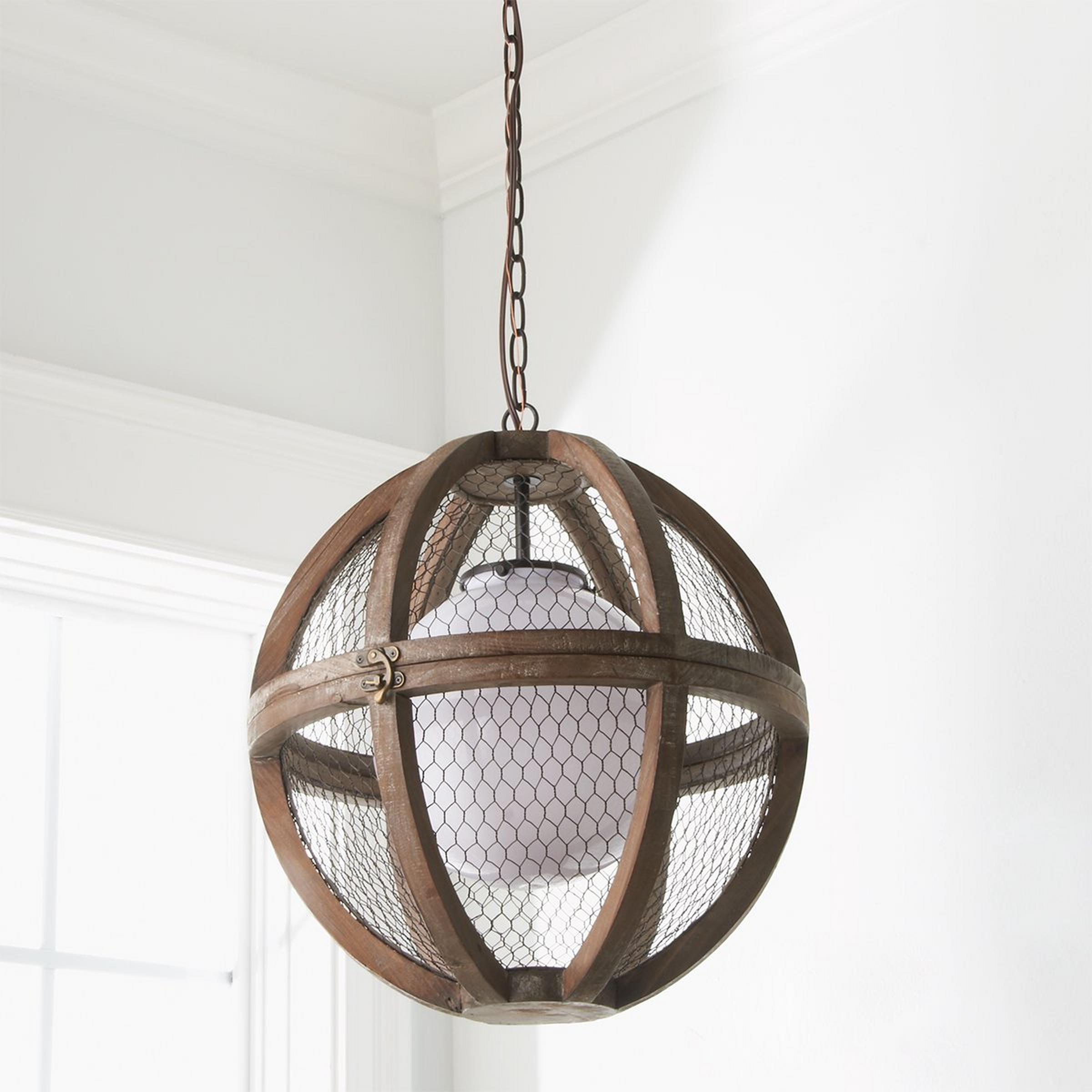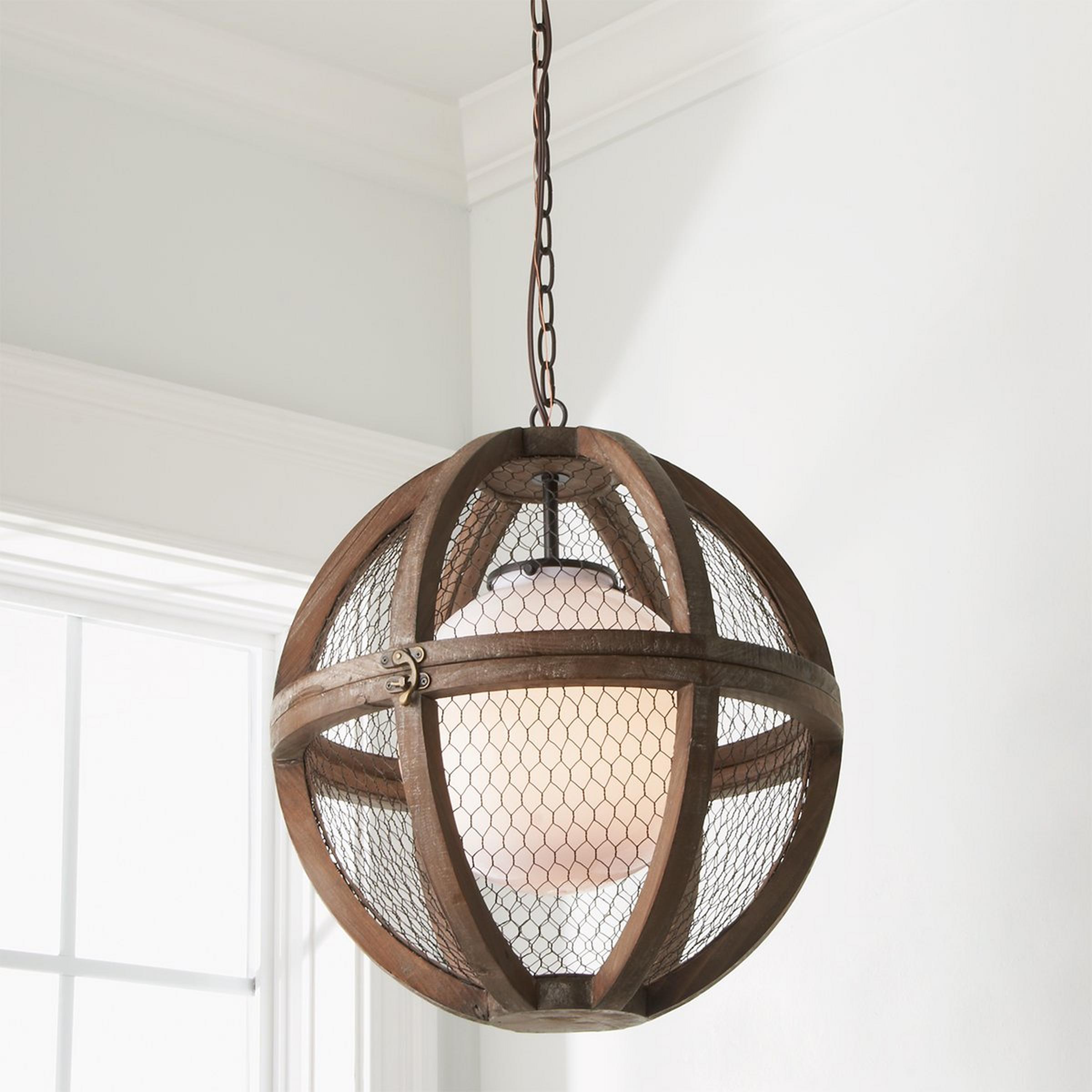 This unique pendant chandelier features a white glass globe enclosed by a chicken wire and wood frame. The orb-shaped fixture is the perfect way to bring an eclectic sensibility to rustic and farmhouse decor themes.