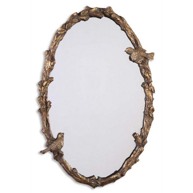 This beautiful rustic mirror is perfect for adding country charm to your space and features a metal vine and bird motif in a distressed Antique Gold finish. (34"Hx22"Wx3"E). 22 lbs.