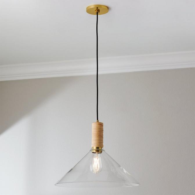 This pendant features a cone-shaped shade made of clear glass, allowing bright light to shine through. The elongated neck is hand-wrapped in raffia palm strands, giving it a casual yet sophisticated feel and adding an organic touch to any environment. Due to the nature of the raffia, variations in tone and pattern are expected and celebrated as they add to each light's exclusivity.
