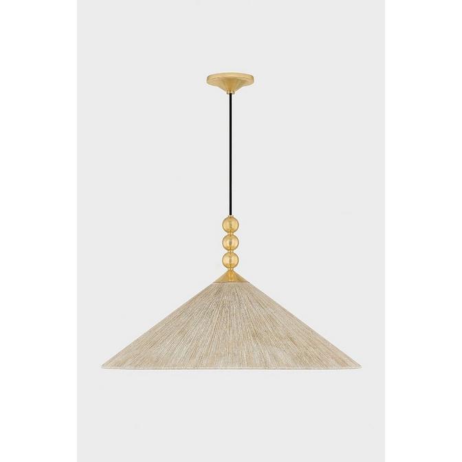 This pendant features a sequence of decorative beading atop a wide tapered shade. The playful materials exude a sense of warmth as light shines down over a dining area, lounge, or kitchen island.